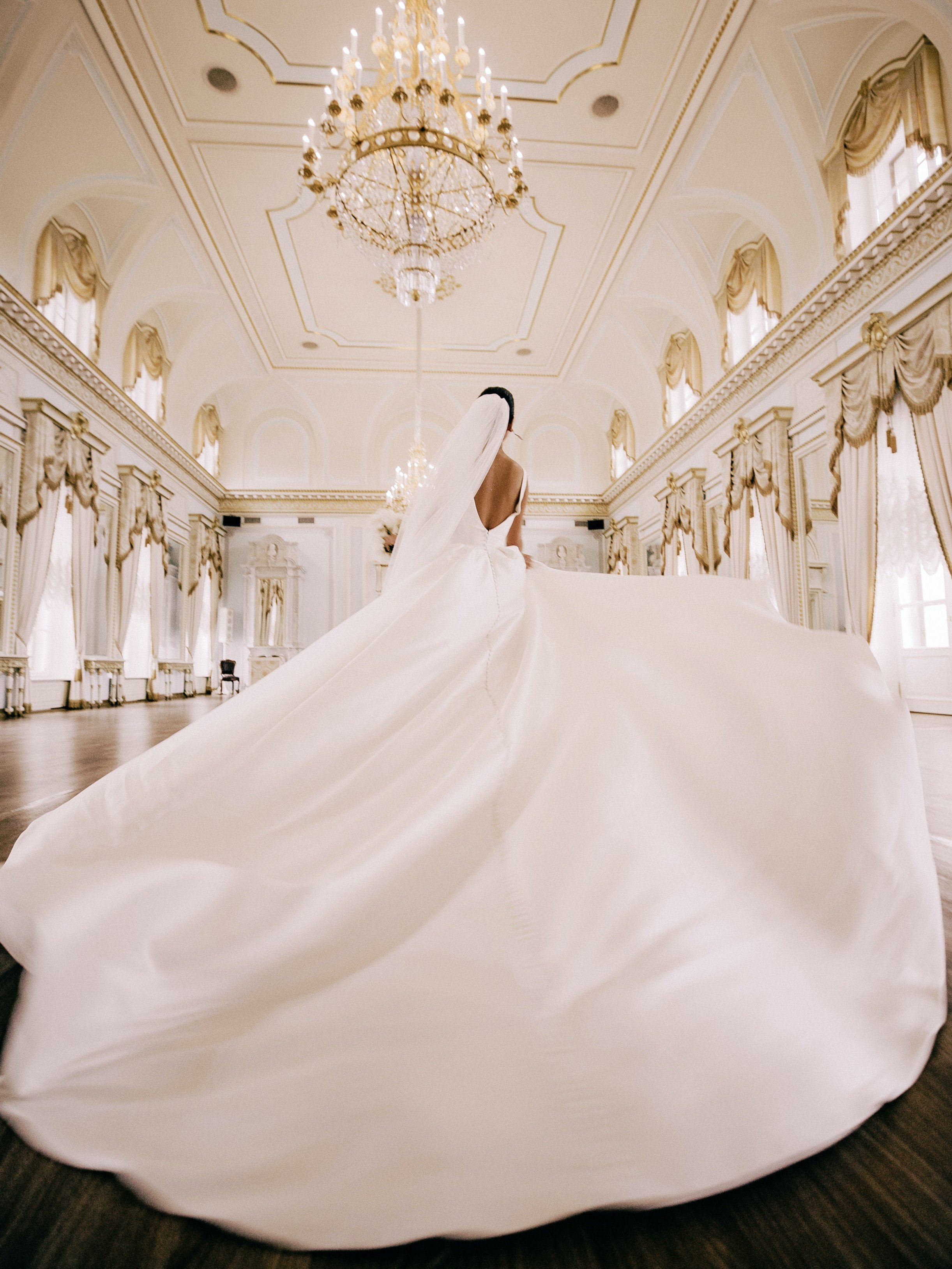 宴会厅:因为在室内举行,所以不受天气、季节等外界客观因素的干扰,适合大气、华丽感十足的婚纱,如重工、闪闪、大拖尾婚纱。不过需要结合 T台过道大小,挑选合适的拖尾。