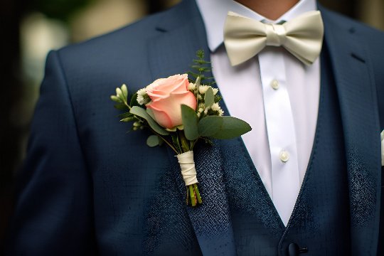 4. 配饰:新郎可佩戴领带、领结等配饰,颜色上与衬衫颜色相呼应。此外,手表、袖扣等小物件的搭配也能彰显新郎的品味。
