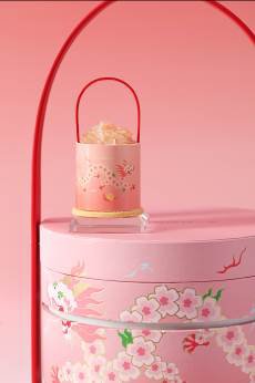灵感源于SHANG XIA上下游龙多宝盒,其造型撷取祥龙与桃花的意象,二者合一幻化为桃花祥龙,凝聚鲜活繁盛的生命意涵。甘润剔透的粉柚果肉,酿入细腻绵密的茶味蛋糕,清甜之间糅合出馥郁香气。