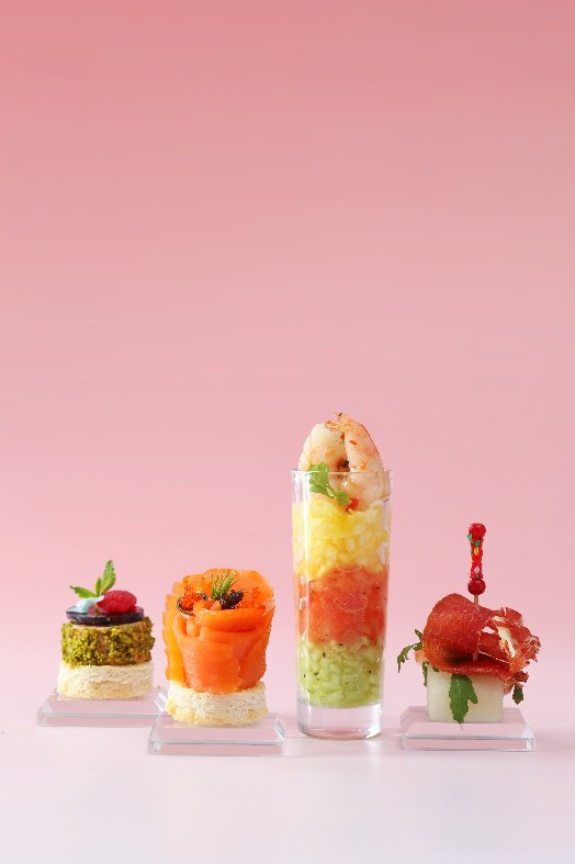 下午茶中特别搭配的咸点也带来独特风味,丰腴细密的鹅肝慕斯油中带润,帕尔马火腿与优质蜜瓜混搭出灵动口感,清新果蔬颗粒,包裹微酸轻辣的泰式虾,瞬间绽放丰富层次。