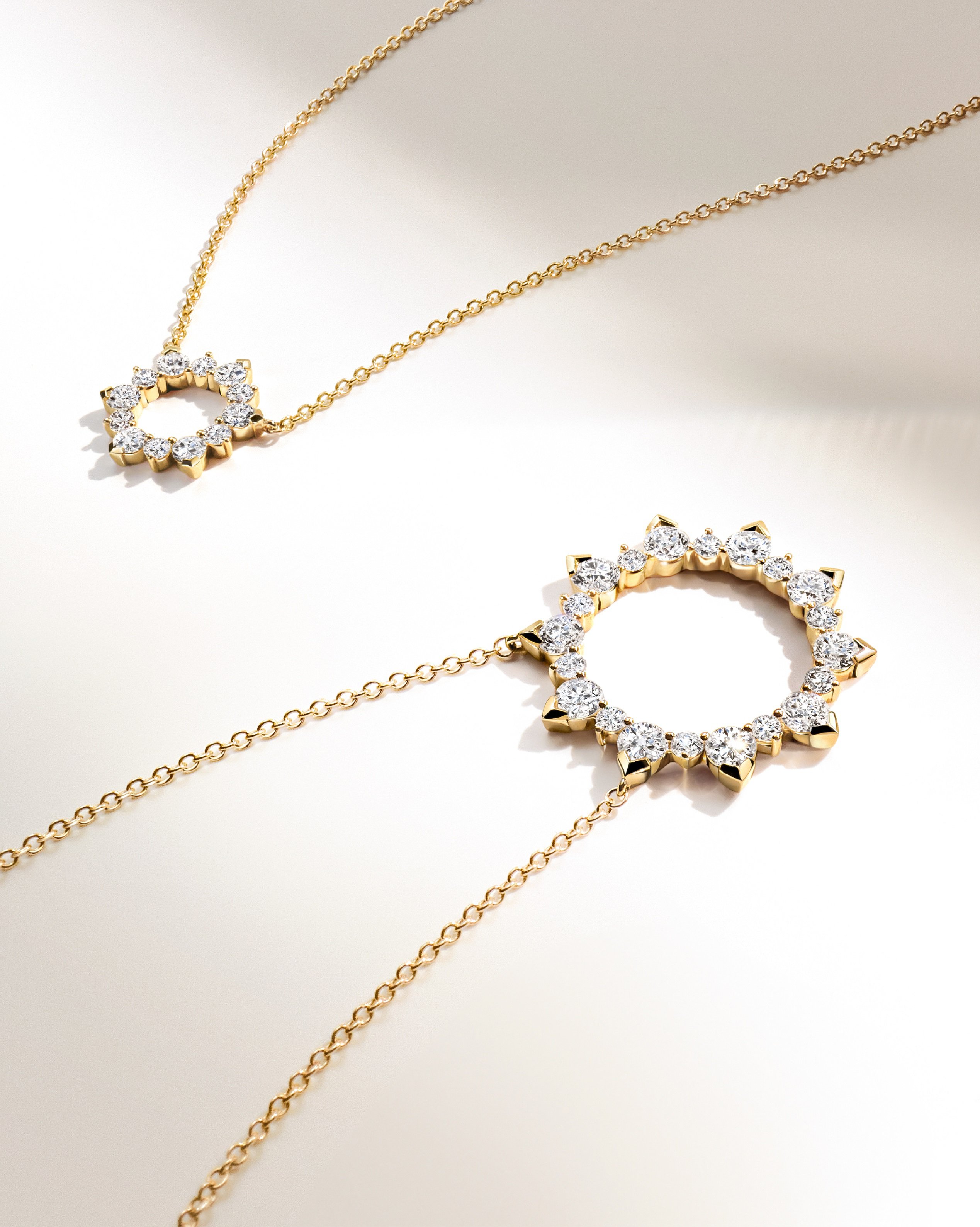 系列每款设计传递自然界瑰丽迷人的变幻之美,风格隽永迷人。Aerial Eclipse钻石项链圆环型设计点缀于颈畔,犹如日蚀般绽放光晕,赋予珠宝独特的吸引力与神秘感。
