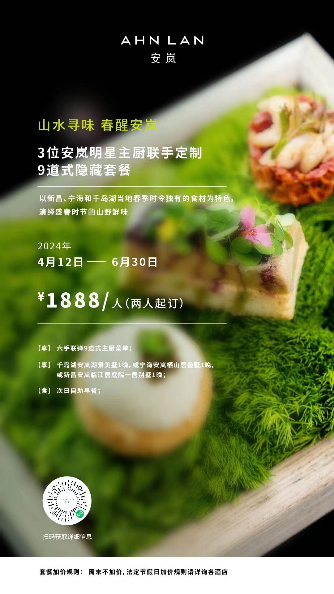 同时,为推广“春醒安岚”菜单,安岚 “山水寻味 春醒安岚”安岚品牌活动落地千岛湖安岚酒店,全方位打造安岚品牌“良辰美景,赏心乐事”的极致隐奢度假体验。