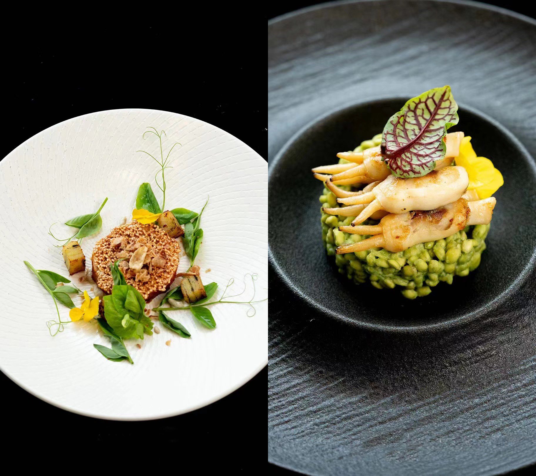 例如,前菜“前童豆腐包佐卡露伽鱼子酱”,前童豆腐的清甜豆香激发了卡露伽鱼子酱的馥郁醇香,层次丰富,各自鲜明,却又相互平衡。再比如,前菜“龙井鹅肝和桑葚鱼子酱茶香荷兰汁”选用大佛龙井入菜,大佛龙井的缕缕茶香赋予鹅肝更为丰富的层次,每一口都见证着对大自然丰饶的敬意。