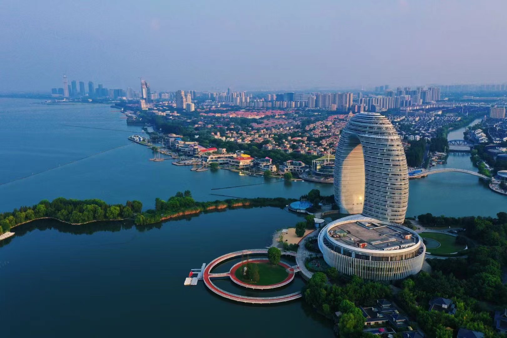湖州太湖喜来登温泉度假酒店形似弯月 状如指环,地起太湖水陆之间,立于风景宜人的南太湖之滨,是湖州的城市地标。酒店由国际建筑大师马岩松先生倾力设计,从中国古典建筑中汲取灵感,融入湖州水墨文化息,将太湖风光与建筑美学结合,栖水而立,璀璨夺目的楼体内部更是奢华与艺术的完美结合,湖州喜来登温泉度假酒店的室内设计采用大量珍贵玉石和石材。