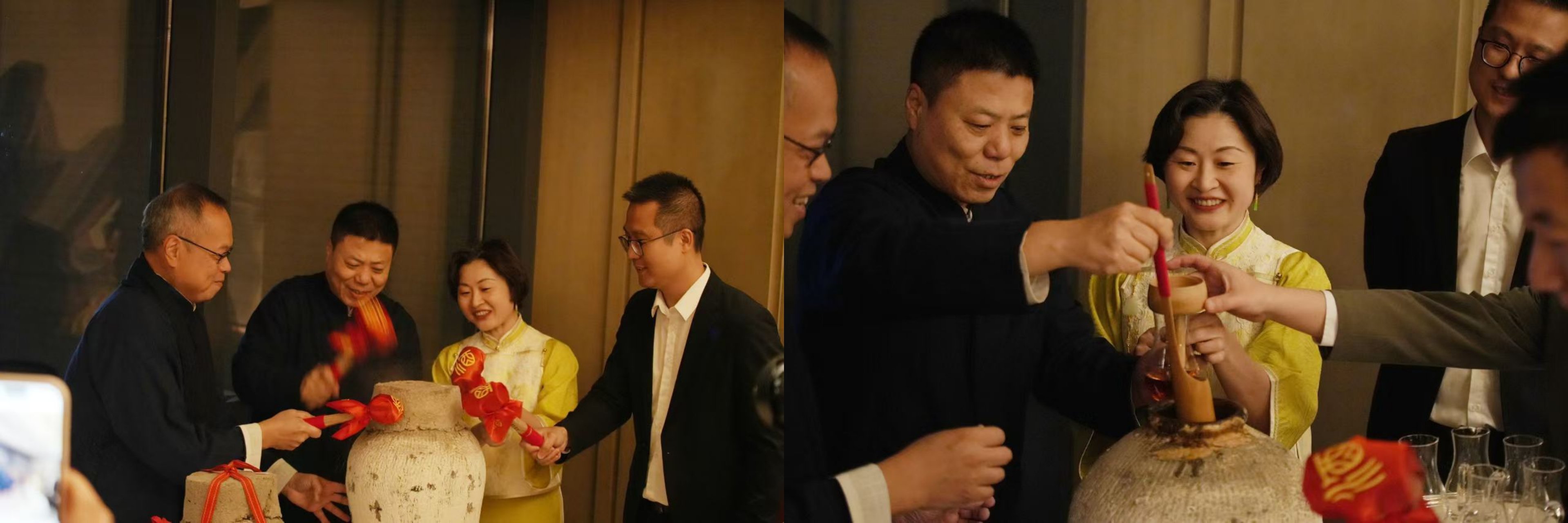 悠扬婉转的评弹曲调中晚宴鸡尾酒会缓缓拉开序幕,调酒师巧妙地将酒酿融入现代鸡尾酒中,创造出既保留传统韵味又不失时尚感的创意饮品,让宾客在轻抿间就能感受到米酒的清甜爽滑。随着夜色渐浓,越剧演员的几曲经典折子戏,袅袅越音中的人生百态配合绍酒,回味无穷。晚宴的高潮部分莫过于绍酒文化的深度体验。「银瓯一枚,贮山阴甜酒」,绍兴酒性温和,醇厚绵长,素以古朴厚道为精髓,是中国自有的古老酒种之一。作为本次活动的核心,元红酒属于干酒,此酒发酵完全,含糖少,酒液橙黄,清亮透明有光泽,并具特有的浓郁醇香,味醇而爽口。加饭酒属于半干酒,相比于元红酒,在原料配比中,饭量增加,由于醪液浓度大,成品酒度高,所以酒质特醇,俗称“肉子厚”。此酒液呈琥珀色,橙黄清亮,晶莹透明,醇香浓郁,醇厚甘鲜。善酿酒是以贮存1~3年的元红酒代水酿成的双套酒,属于半甜酒。酒色呈深橙黄色,其香芳郁,质地特浓,口味鲜甜爽口,为绍兴绍酒中的高档品种,深受不善饮酒者的欢迎。香雪酒以陈年糟烧代水用淋饭法酿制而成,也是一种双套酒,属于甜酒类。酒液淡黄清亮,芳香幽雅,鲜甜醇厚。