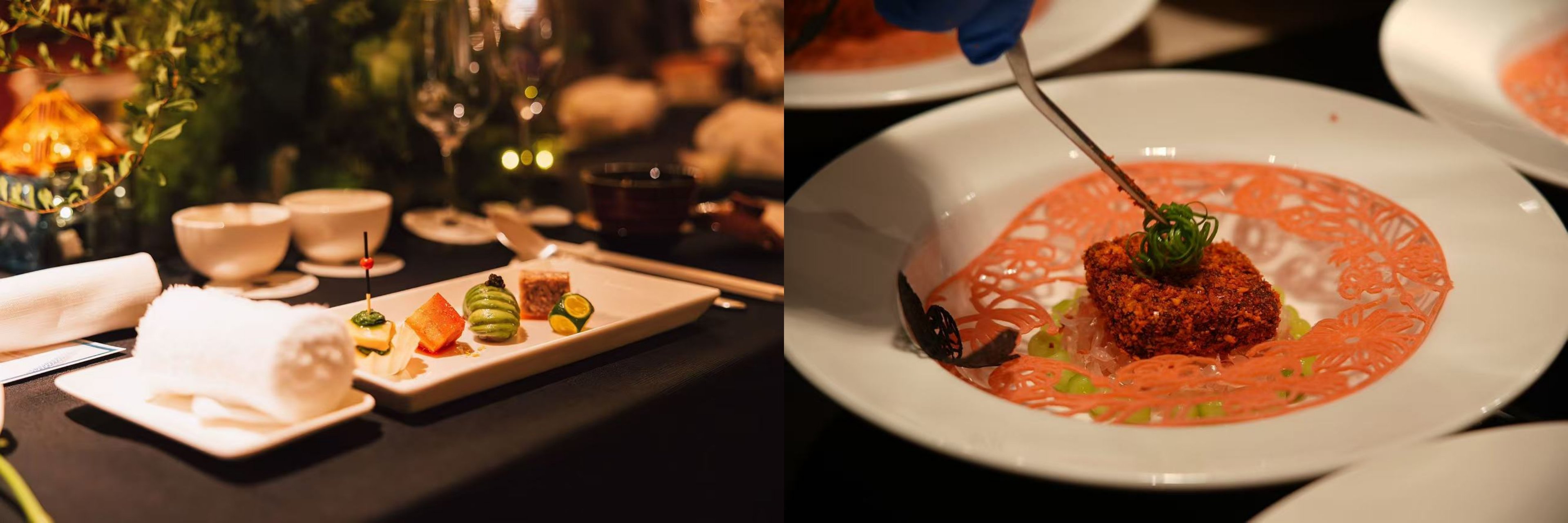 晚宴以“岁序感恩”为主题,秋末初冬时节邀宾客一同品尝美食与美酒中的暖意。傍晚时分,宜兴宝利丰汽车销售服务有限公司带来新款车型,为宾客们提供试乘试驾,让宾客穿梭于山林竹海之间,感受现代与复古风情完美交融。宾客们身着旗袍长衫,为晚宴增添了一抹别样的风采,富有江南特色的经典表演,传神地展现了吴文化的魅力。晚宴的出品更是别出心裁,来自绍兴的四种主要品类:元红、加饭、善酿、香雪搭配应季食材,展示绍兴酒不同酒精度与糖分带来的多重口感与各种烹饪手法配合后或和谐或冲击的奇妙感觉,呈现雅达溪山的锦绣夜筵。