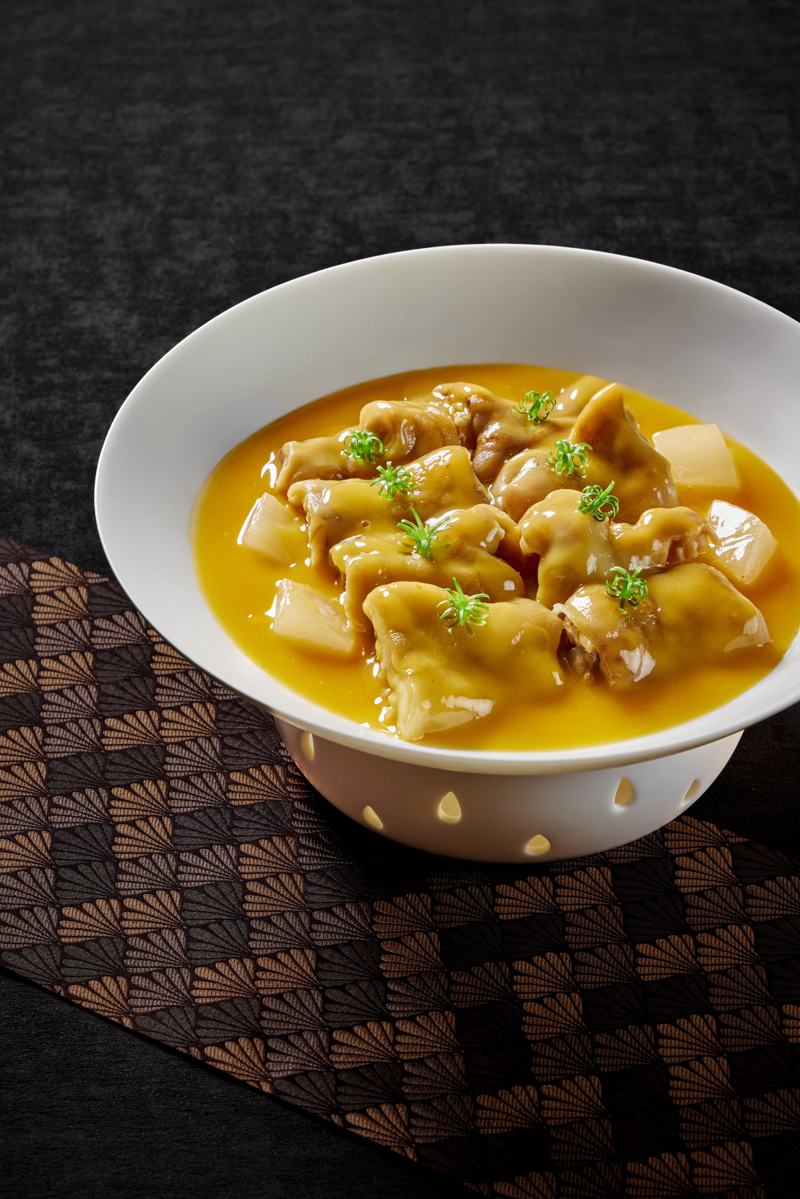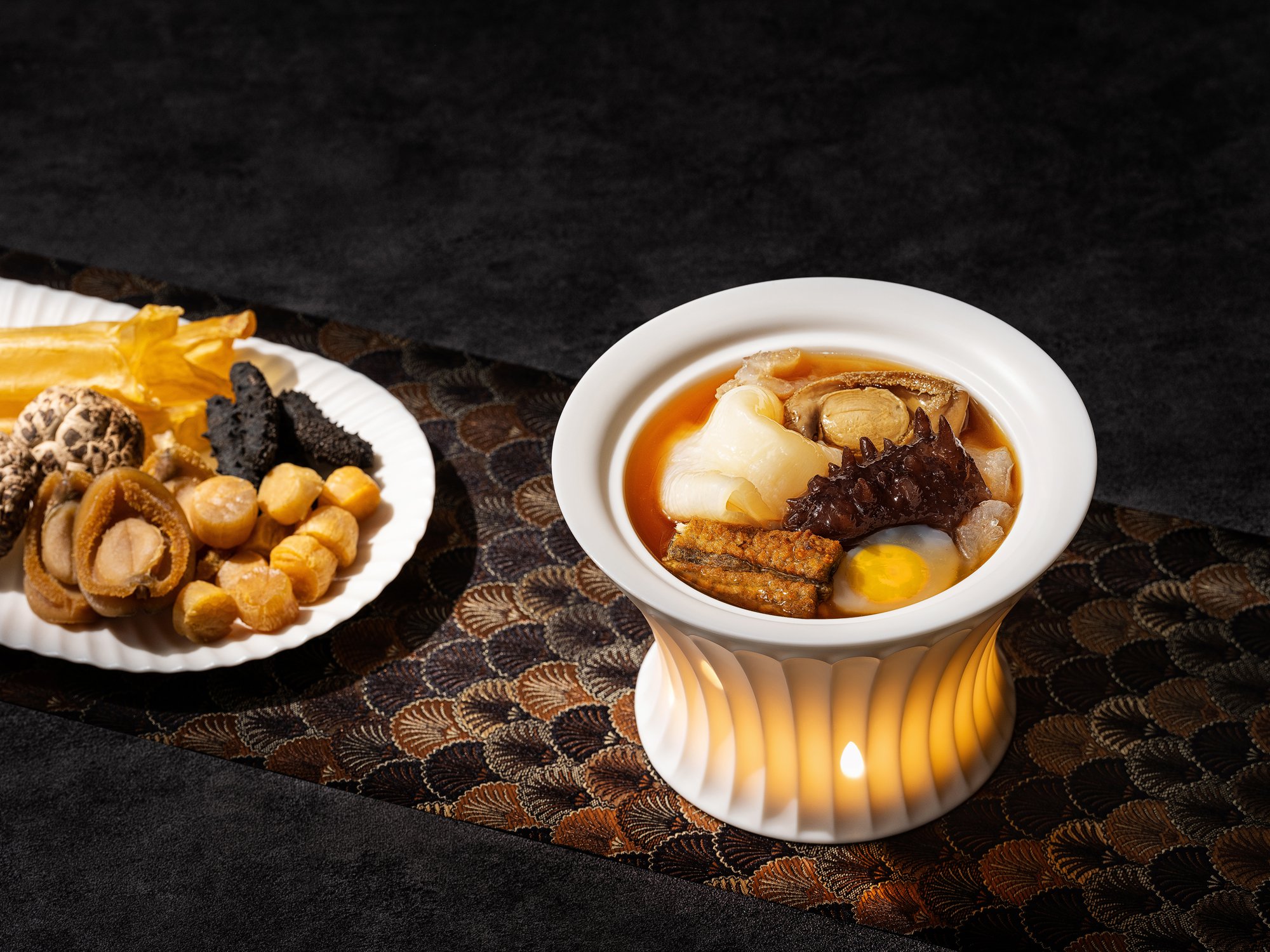 这是一道融合了传统与创新的巧思之作,以名菜“佛跳墙”为基础,加入了淮扬菜经典“炖生敲”, “生敲”是将鳝鱼去骨后用刀背敲松,再炸酥后加高汤慢煮,搭配海参、鲍鱼、花胶、鸽子蛋等名贵食材。以“粤式一炉火,慢炖六小时”的经典炖汤技艺,成就了这一盅亮眼之作。汤底清澈而淳香,细品之下带有陈皮的香气,让人回味无穷。