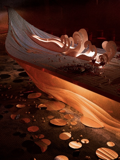 展览以“潺瞐”为灵感线索,通过婚礼艺术静态陈列,巧妙融合酒店的历史底蕴与现代风格。场景设计以“叠影剧场”为核心理念,将东方美学意象转化为西式空间结构,构建出一个兼具文学深度与视觉美感的艺术现场。在空间布局上,设计师以“圆”为镜,象征江上初升的旭日,也隐喻连接过去与未来的时空隧道;同时巧妙转化“舟”的意象,将东方扁舟演变为西式长桌,寓意一场跨越文化的共融与宴聚,展现东西方美学的深情对话。