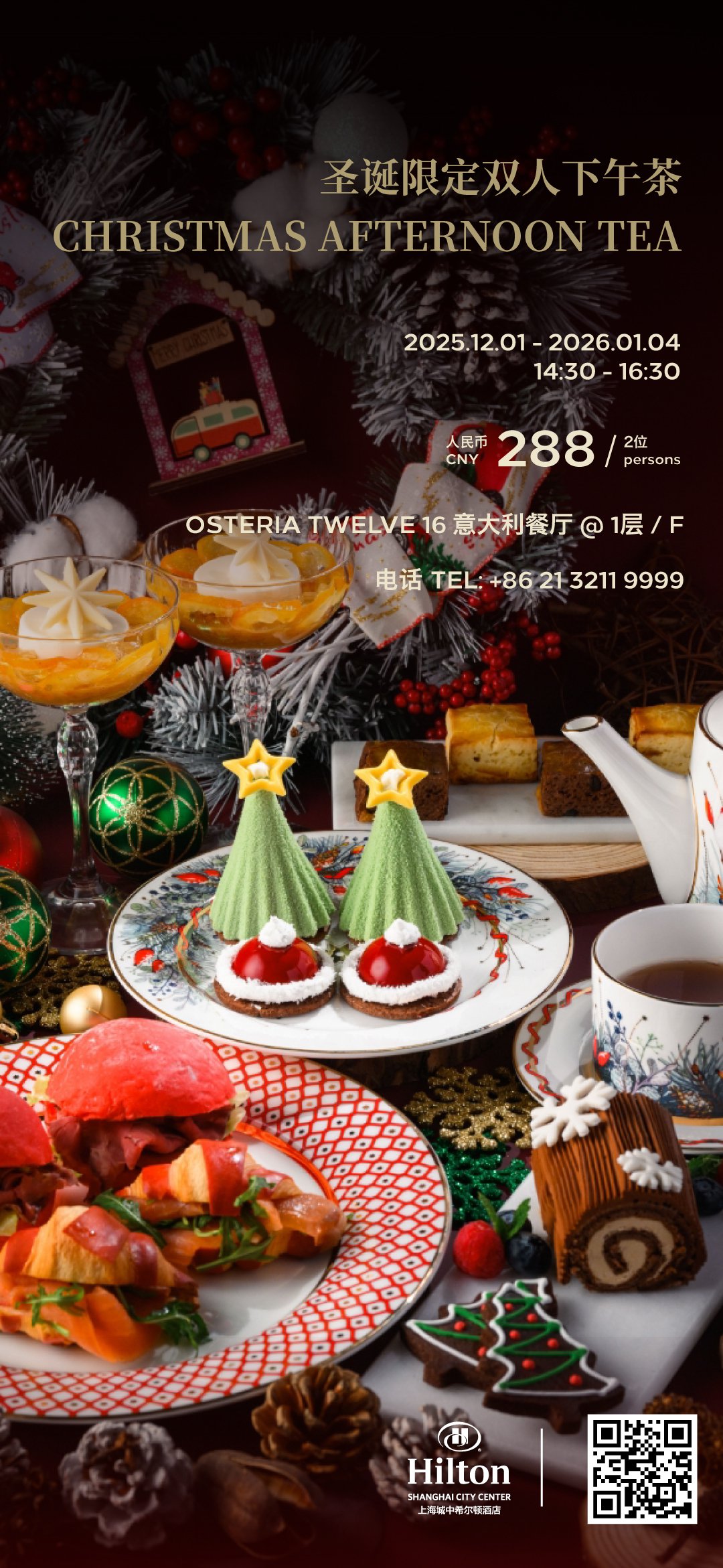 以意式温情为底色,将圣诞风味融入每一道甜点与小食。酥香的黄油羊角包包裹烟熏三文鱼,咸香馥郁;烤牛肉三明治层次丰盈、口感饱满。抹茶慕斯化作迷你“圣诞树”,搭配其他圣诞限定甜点,呈现冬日独有的节日仪式感。有效期:2025年12月1日至2026年1月4日14:30-16:30,两位 288 元。