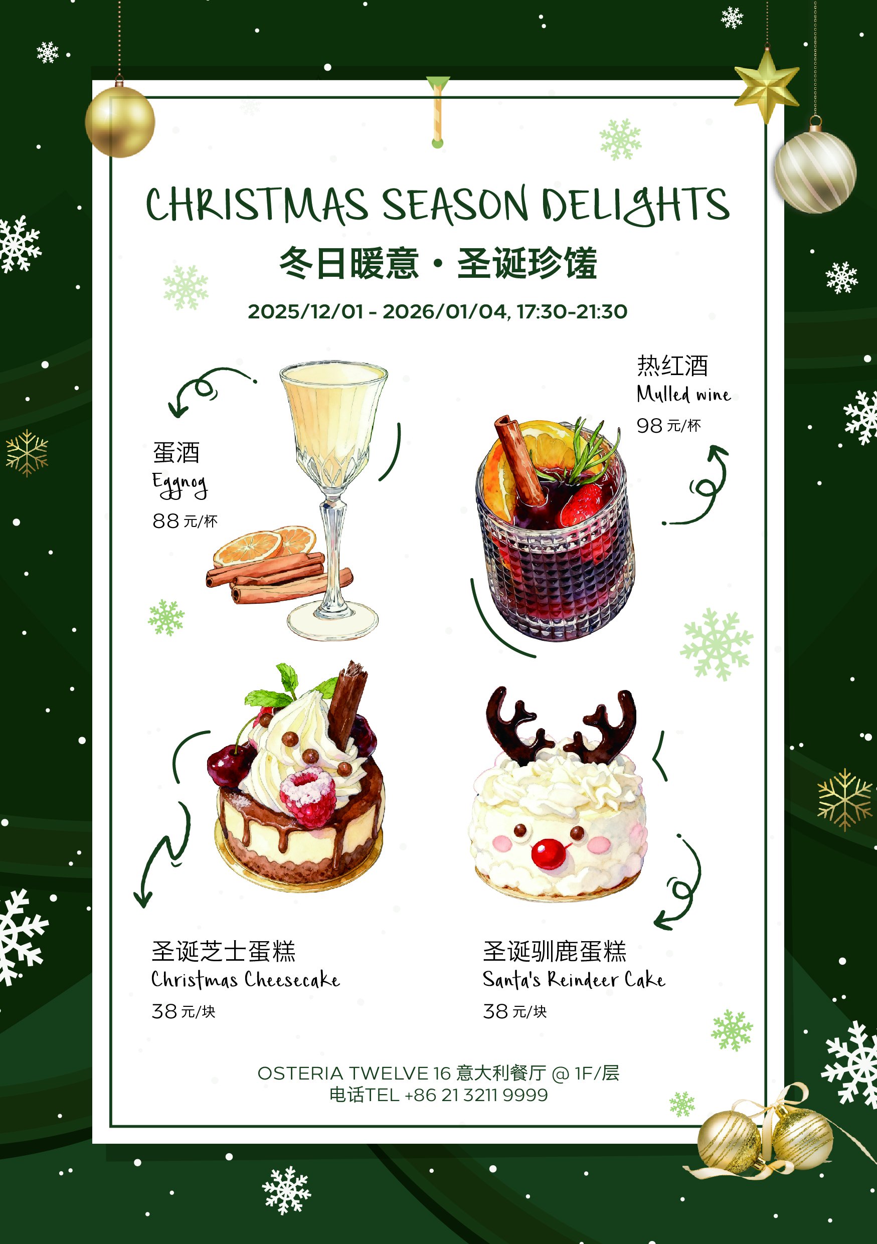 从黄昏到夜色渐深,香料萦绕的热红酒、绵滑浓郁的蛋酒,与圣诞限定蛋糕一同构成冬季最柔软的味觉记忆。无论是独自放松,或与好友小聚,这段“冬日序曲”都将在 Osteria Twelve 16 缓缓展开。有效期:2025年12月1日至2026年1月4日17:30-21:30。
