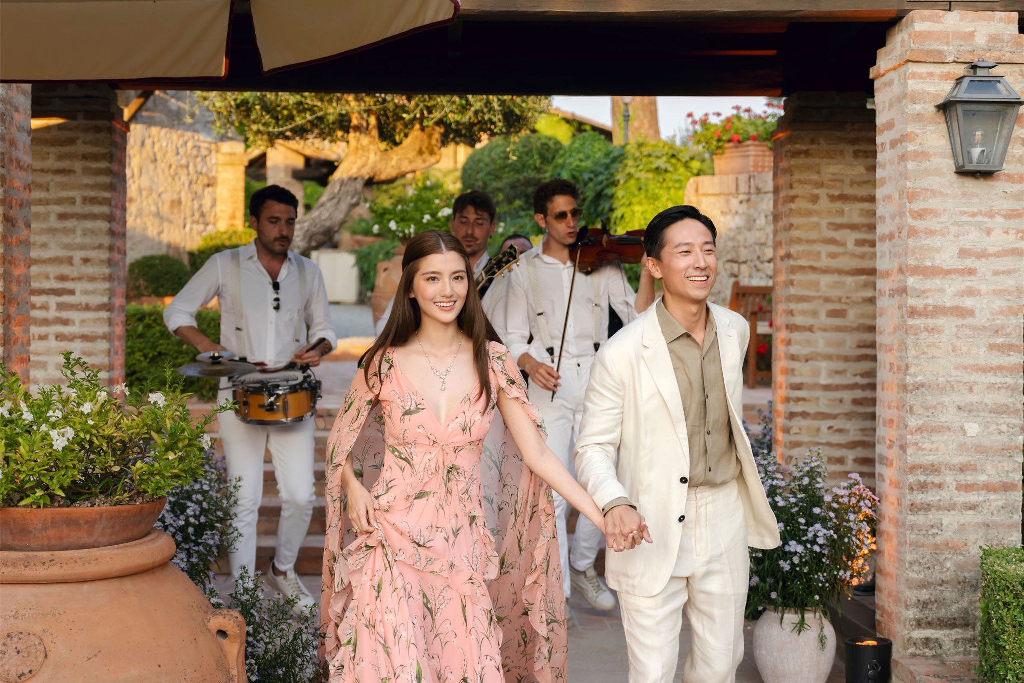 2024年8月3日,演员吴千语与施伯雄在意大利托斯卡纳举办温馨浪漫的欢迎晚宴,为婚礼预热。 新娘吴千语身穿Carolina Herrera Cabana 2024胶囊系列粉色拖尾印花礼服,簇簇繁花点缀于粉色裙...