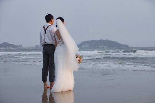 我们站在海边,面朝大海,背后是广阔的蓝天和朵朵白云。摄影师在我们面前按下快门,记录下我们幸福的笑容和坚定的眼神。那一刻,我们仿佛感受到了大海的深情,也体会到了爱情的伟大。婚纱在风中飘逸,与海浪相互映衬,我们仿佛化身为海的女儿,守护着属于我们的爱情。