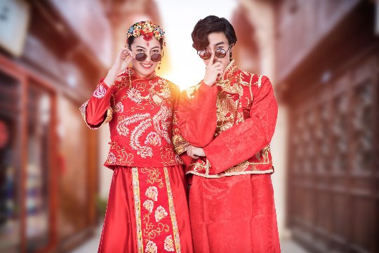 新中式婚纱照中的服饰,既有传统的汉服、旗袍等,也有结合现代审美的改良版。新娘可以选择一袭华丽的汉服,展现古典气质;或是一身精致的旗袍,凸显曼妙身姿。新郎则可以身着中山装、唐装等,彰显大气磅礴的气度。在造型上,通过头饰、耳环、发簪等细节的点缀,进一步凸显中式韵味。