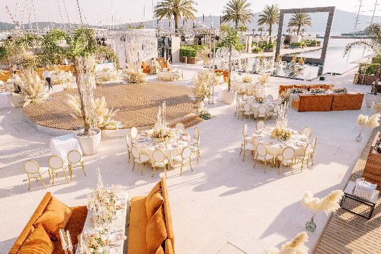 户外结婚圆桌布置的色彩搭配至关重要,应与婚礼主题和场地环境相协调。以下是一些建议: