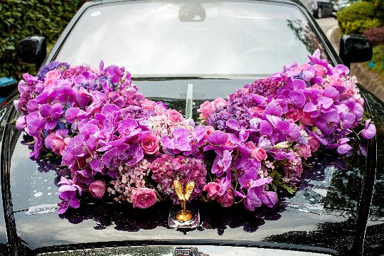 1. 车头:车头是婚车装饰的重点,常用西式插花风格,将花叶组合成规则或不规则的图案,置于车盖中央或两侧。