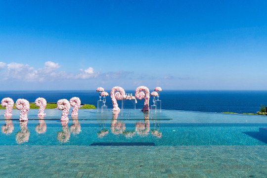 婚礼当天,新郎新娘携手走在用鲜花和海螺壳铺设的小路上,步入了由海蓝色鲜花拱门迎接的婚典现场。阳光透过鲜花,洒在新人身上,犹如一层神圣的光环,为这场婚礼增添了几分浪漫色彩。