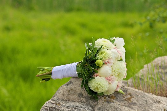 3. 根据新娘的服装和整体造型,选择合适的手捧花款式。