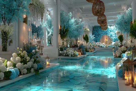 1. 蓝色灯光:在婚礼现场布置蓝色灯光,如LED灯、霓虹灯等,营造出梦幻般的氛围。灯光可以随着音乐节奏变换颜色,增加婚礼的趣味性。