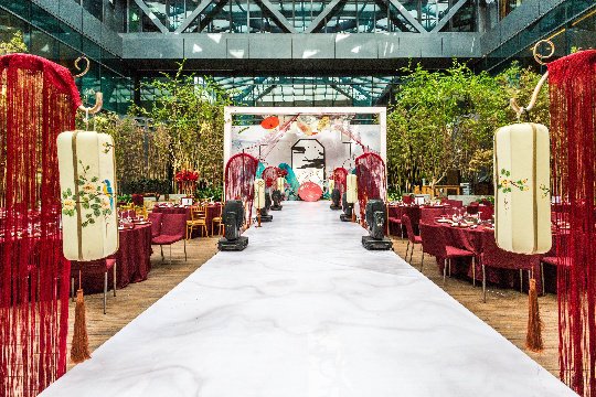 迎宾区设置活字印刷互动装置,宾客可自选吉祥字模蘸朱砂拓印成祝福卷轴。宴会桌中央的「微型园林」苔藓造景内,藏有二维码可解锁新人爱情故事的音频章节。