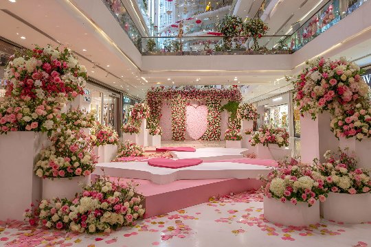 通道:花瓣地毯或粉色灯笼,引导宾客目光聚焦新人入场。