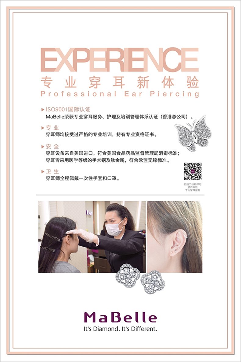 MaBelle玛贝尔于2012年创新推出“专业、安全、卫生”的「专业穿耳新体验」,现荣获专业穿耳服务、护理及培训管理体系认证(香港总公司)。
