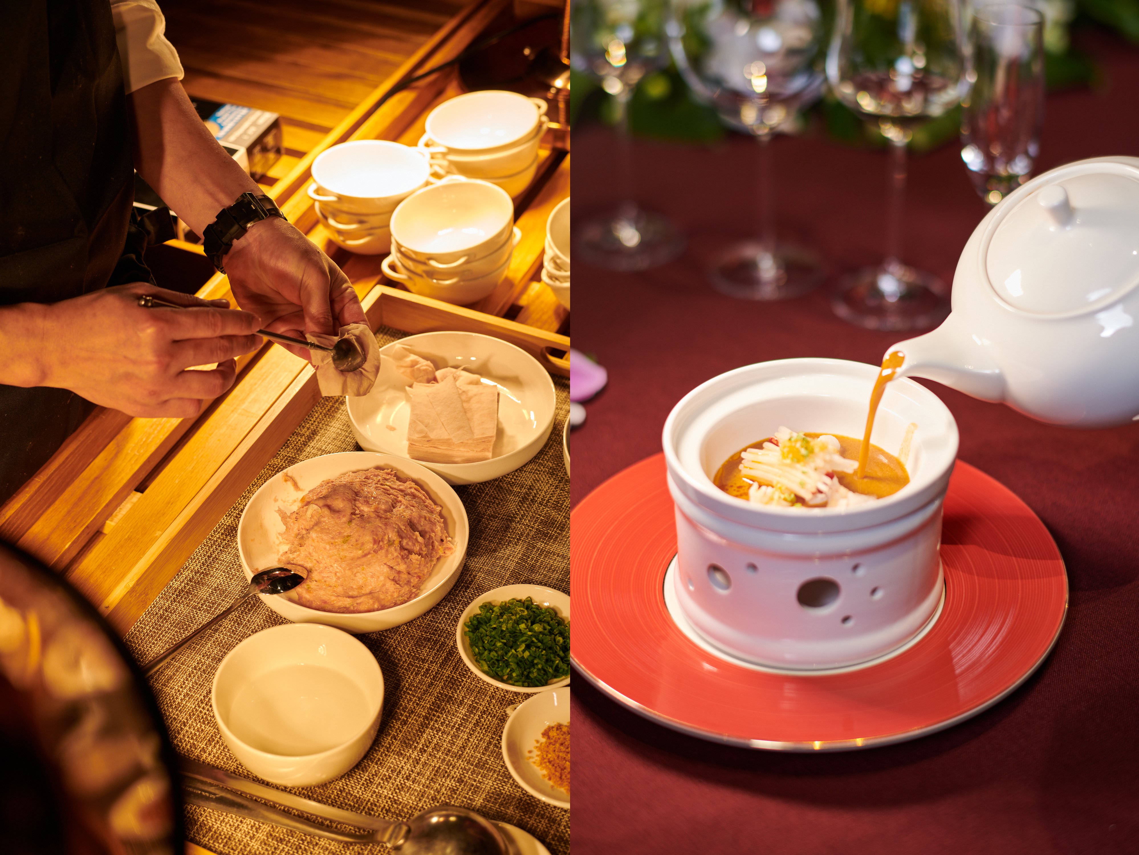 搭配来自美国的 Hall郝尔长相思白葡萄酒。初入口时优雅的花果香气,伴有干净圆润的矿物质感回味,其清新爽脆的口感完美平衡了这道浓郁复合的鹭岛沙茶龙虾汤,不仅为整道菜提升了口感层次,也为之注入了更多的活力与生机。