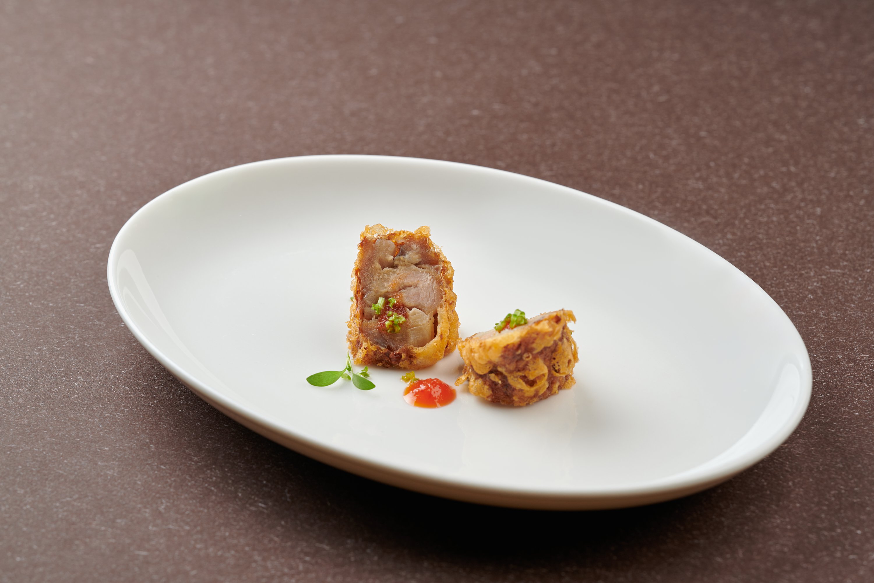 灵感来源于“闽菜皇后”鸡汤汆海蚌,将其通过福建著名小吃“土笋冻”的方式呈现,花胶经过熬煮后所含胶质融入汤中,冷却后即成果冻状,形如琥珀,晶莹剔透,口感清脆,味美甘甜。