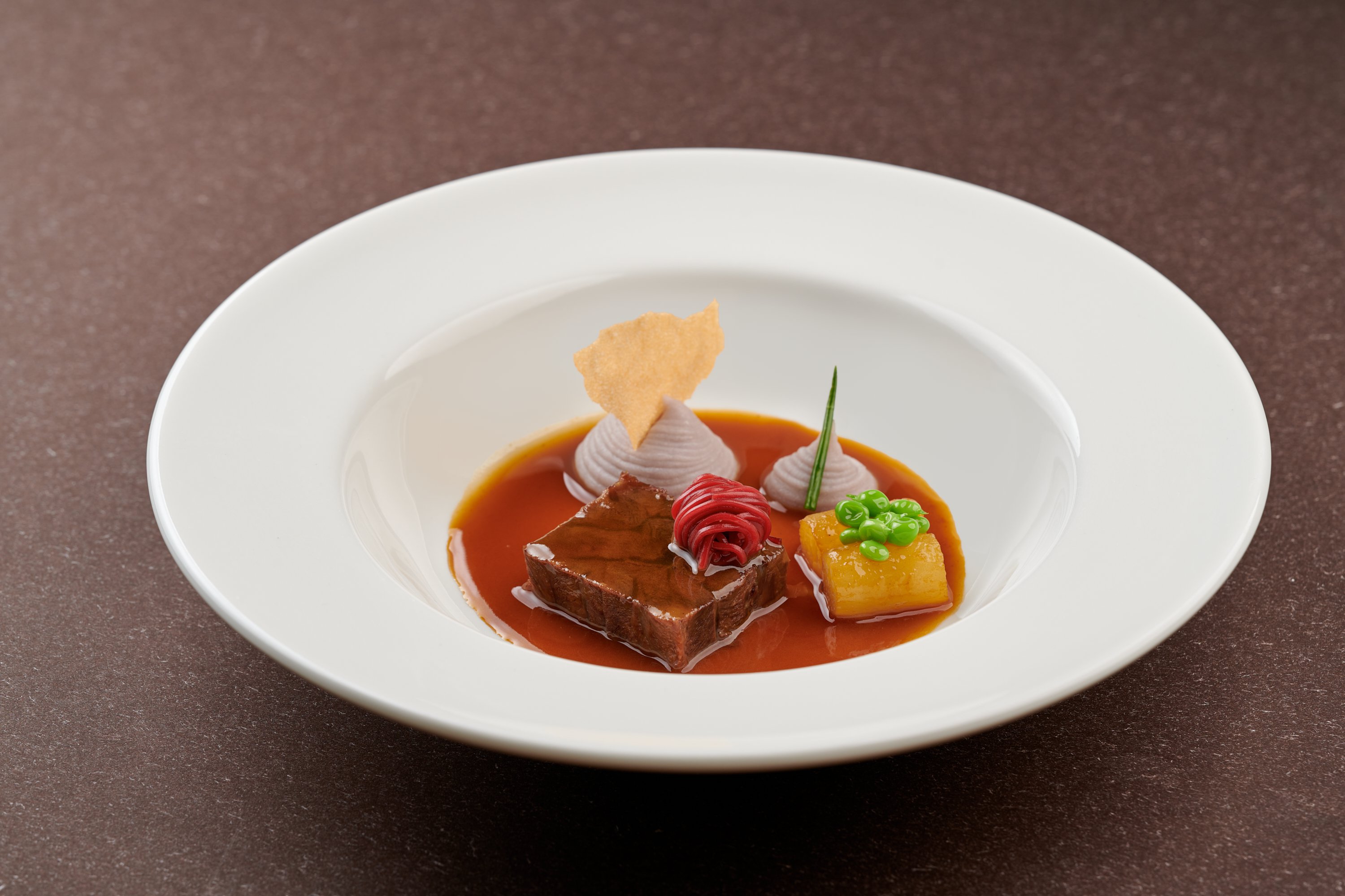 2024米其林发布会晚宴菜单之一,美如其名。腌制好的牛腱子肉经过小火慢炖,催化食材的香气,炖煮到酥烂后,和捣碎的芋泥,再混合特别的生蚝汁,红面线衬底,独特的口感融合了山海之味。