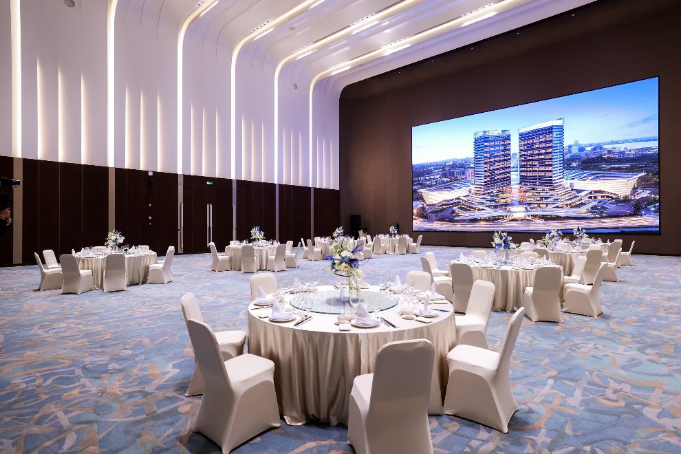 上海临港锦江国际酒店坐落于上海临港新片区国际创新协同区,与城市氧吧滴水湖毗邻而居。酒店运营逾6.5万平方米超大会议空间,特色无柱场地“潮悦堂”面积为3,000平米,挑高13米,可灵活分隔成3个独立且隔音的宴会厅。此外,酒店还拥有多个室内奢华场地以及户外草坪,配备唯美灯光及音乐,让宾客在享受婚礼浪漫的同时还可领略别具一格的视听体验。
