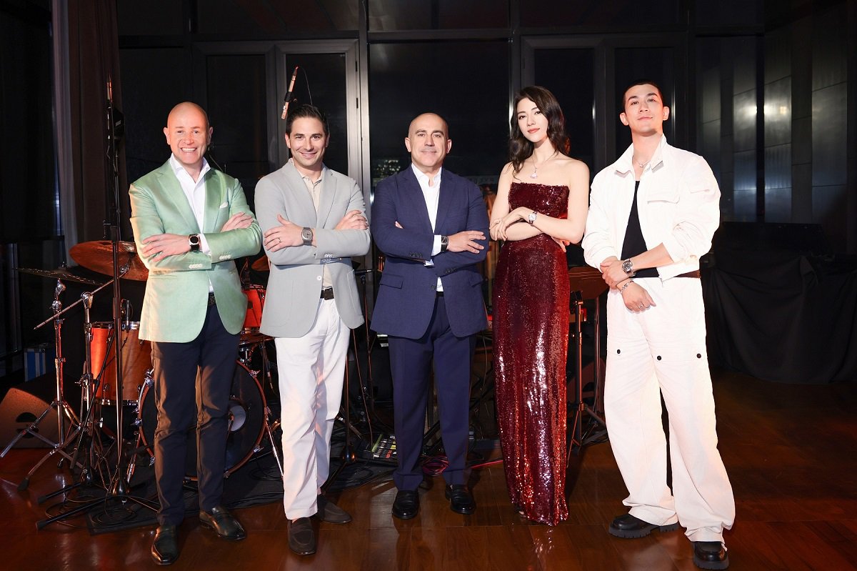 由左至右:上海宝格丽酒店总经理戴万杰(Matthias Terrettaz)、宝格丽大中华董事总经理(Adam Hershman)、宝格丽全球销售执行副总裁文胜佐(Vincenzo Pujia)、演员娜然及演员李治廷