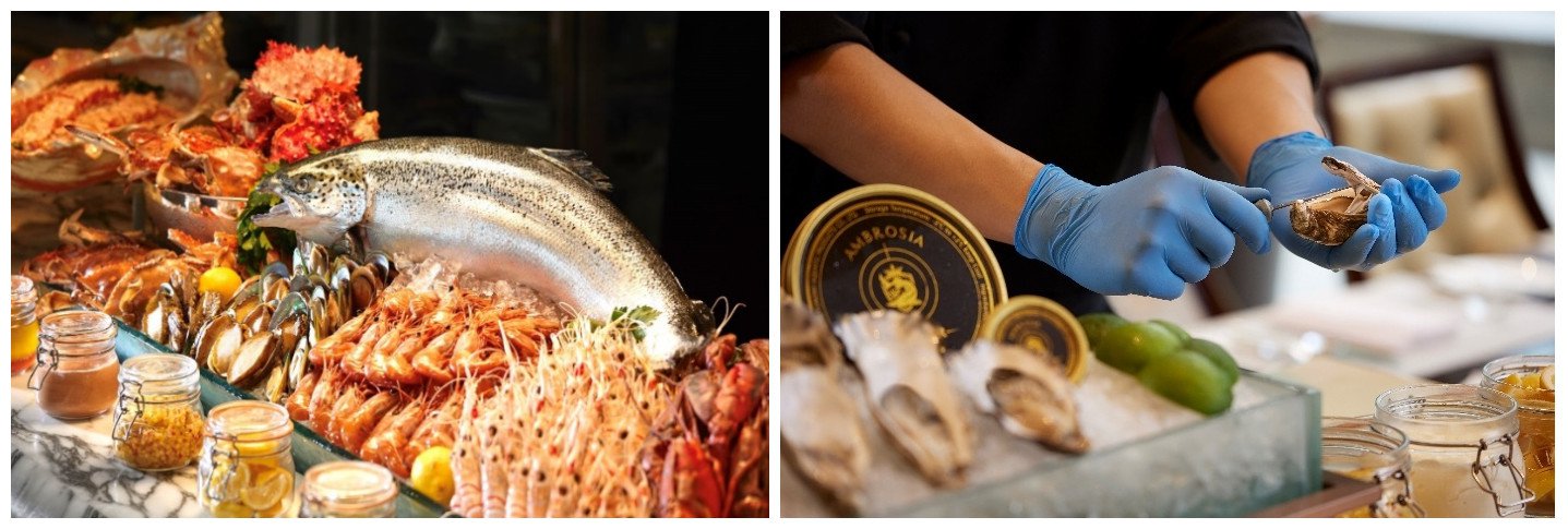 汇集各地鲜美海味,诠释食材原味以及最初质地的味蕾体验。鲜活的帝皇蟹腿、波士顿龙虾整只现开,新西兰海螯虾、蛤蜊及澳洲鲍鱼等鲜美的滋味呈现于桌前。产于爱尔兰、新西兰、法国的生蚝肥美丰腴,入口便是浓郁的海水味道,而后伴有淡淡甜味。另有吉拉多生蚝2号现场派送,送至席间,配上一勺圆润饱满、微泛金黄光泽的鱼子酱,甘甜与咸鲜叠加。