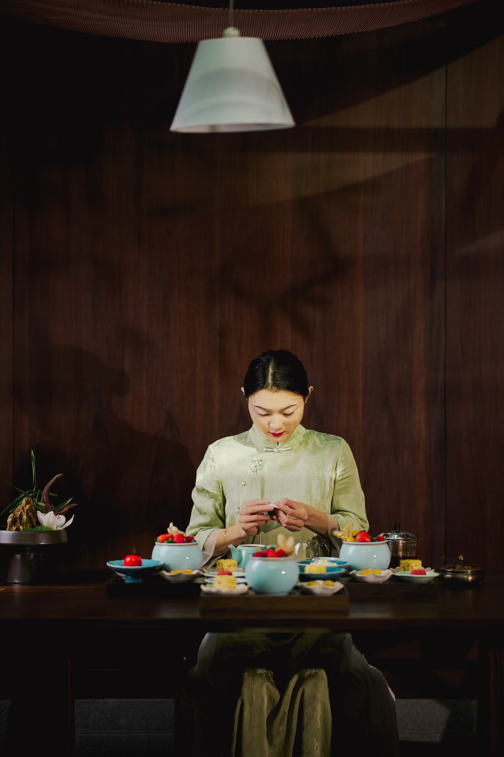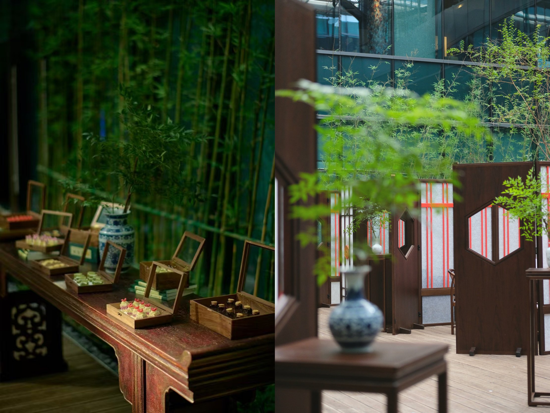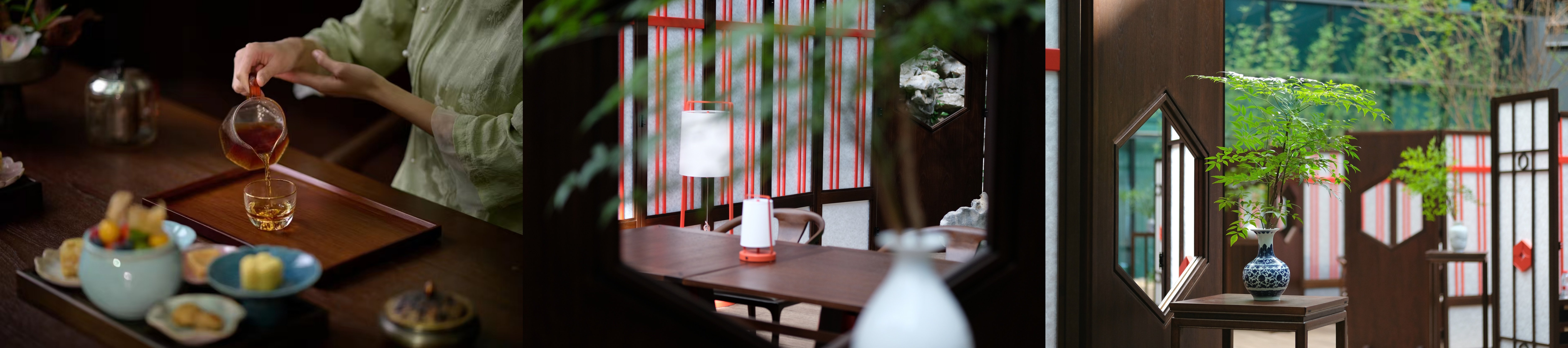 挑高15米的中庭设计,搭配极简原木色,点缀的红色店标中和绿色空间,极简自然,自成一派。信步而入,现代简约的新中式装饰风格。每个茶室内景与前景以窗为媒,透出淡淡光影,绿意交相辉映,空气中弥漫着淡淡的茶香与竹香,让人不由自主地放慢脚步,沉浸在这份宁静与雅致之中。