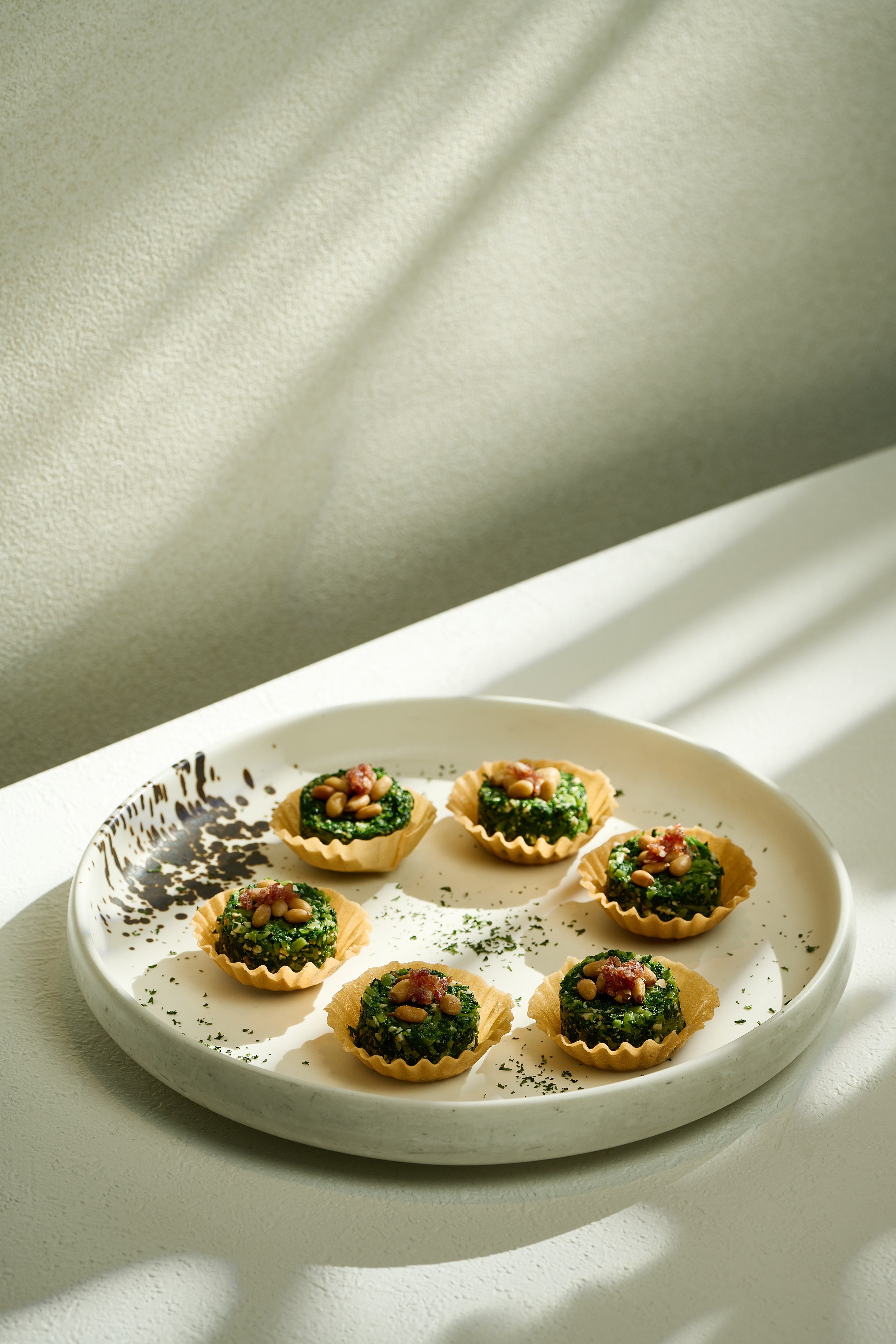 春日马兰头揉入细碎茶干,裹入手工酥脆挞盏。草本清香与豆干醇厚交织,挞皮脆响,悦自然风味。