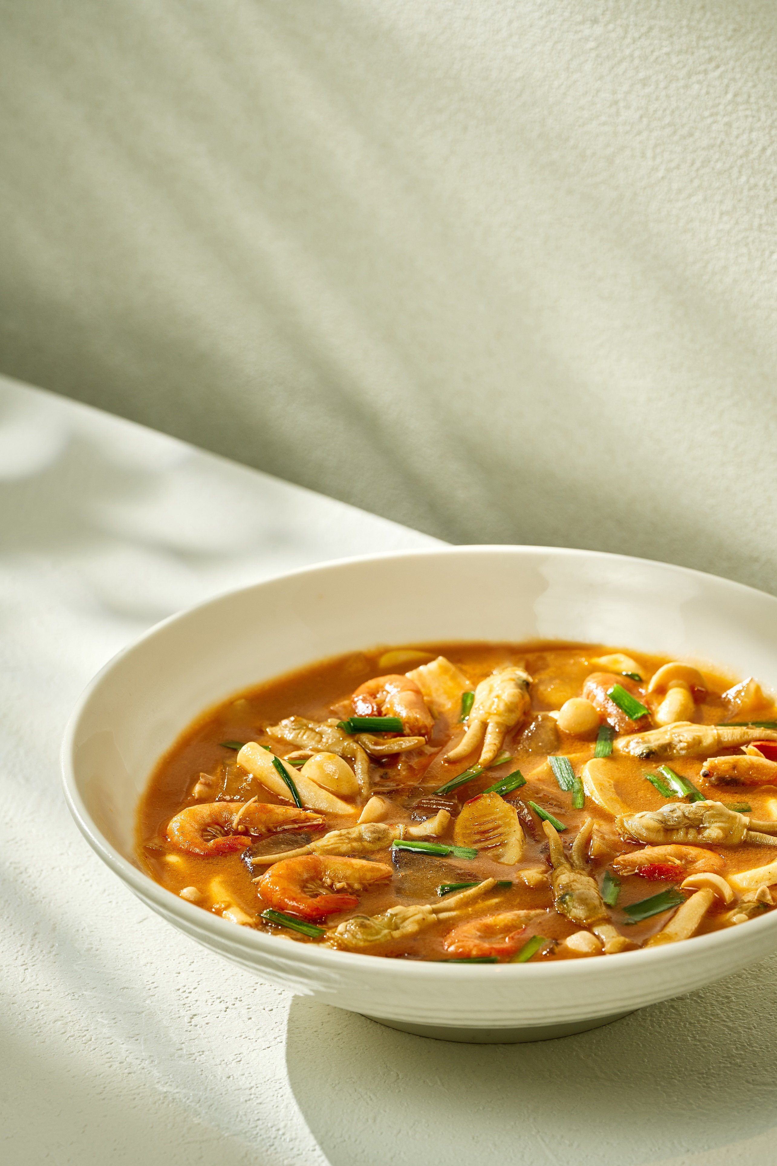 鲜嫩虾蛏,韭香提味,绿豆银皮吸饱浓郁汤汁。海鲜鲜甜、时蔬清香、豆皮柔滑,在暖调汤汁中浑然一体,勾勒春日丰饶。