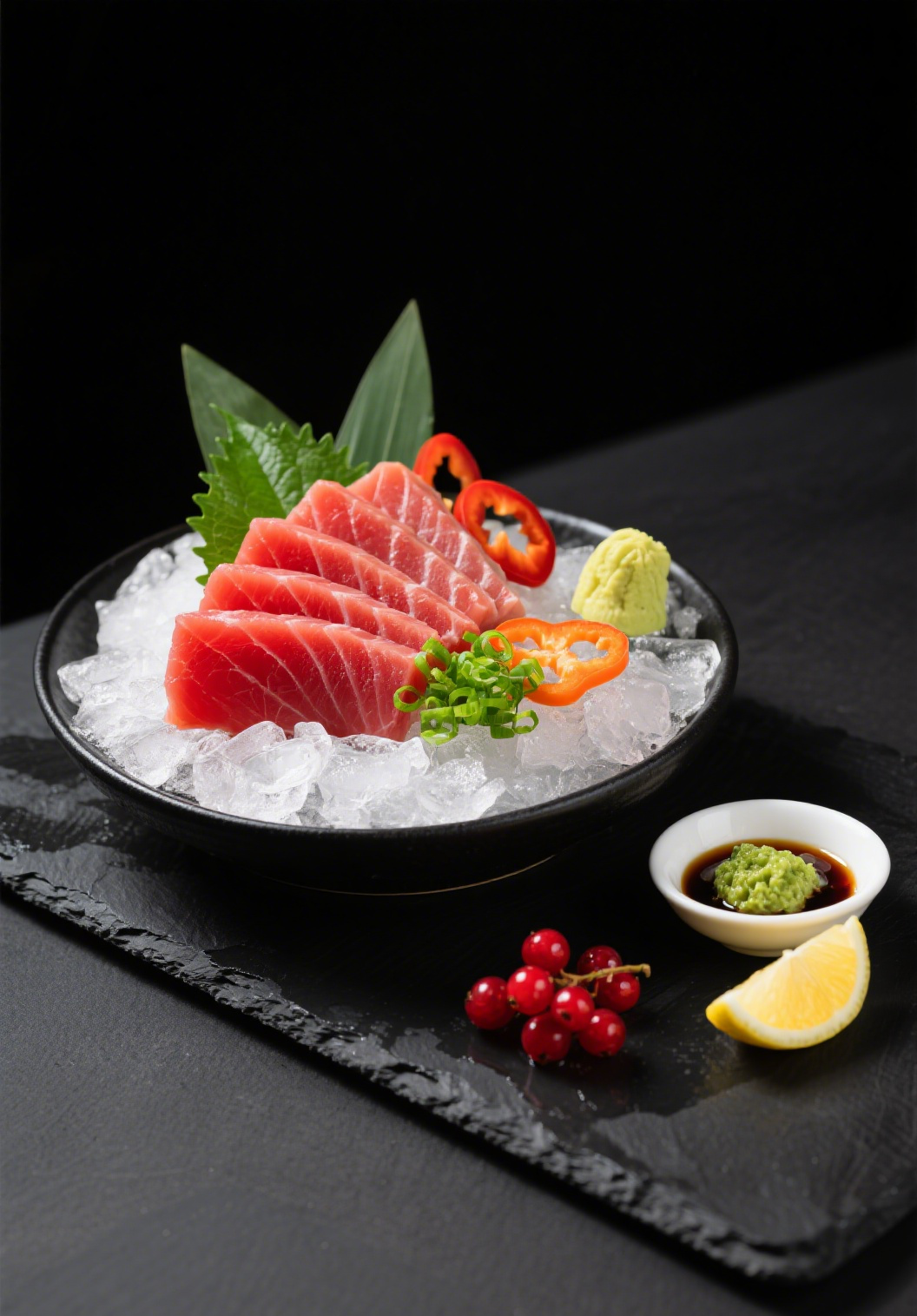 由资深寿司师傅于开放式料理台现场呈现,金枪鱼手握盛宴:蓝鳍金枪鱼大腹、中腹、赤身酱油渍手握寿司、金枪鱼肉塔塔配伊朗鱼子酱、日式酱油渍鳌虾佐鲟鱼子、清酒鲍鱼酢伴鲍鱼肝酱……每一贯寿司皆是对时令风物的精准表达。还有新鲜刺身,三文鱼、章鱼、北极甜虾、北极贝等