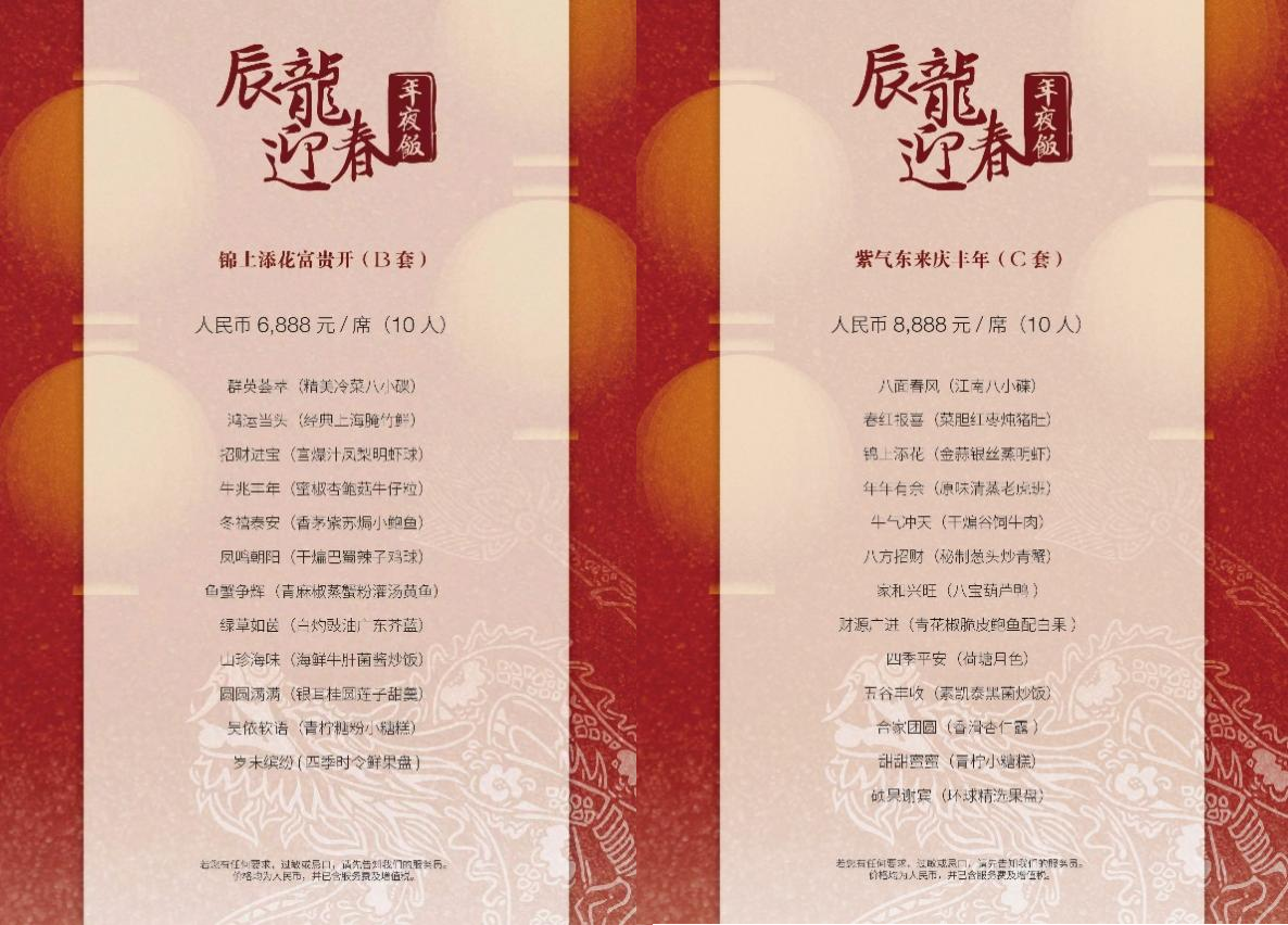 龙年夜宴特别呈现了四款精心设计的菜单,分别是“辰龙迎春福禄至”- 3,888元/席(6人),“聚福迎新庆团圆”- 5,888元/席(10人),“锦上添花富贵开” - 6,888元/席(10人),“紫气东来庆丰年” - 8,888元/席(10人)。菜名均展示了浓浓的中国元素,盛满四方包罗万象之食事,共赴同一份年岁泰安。