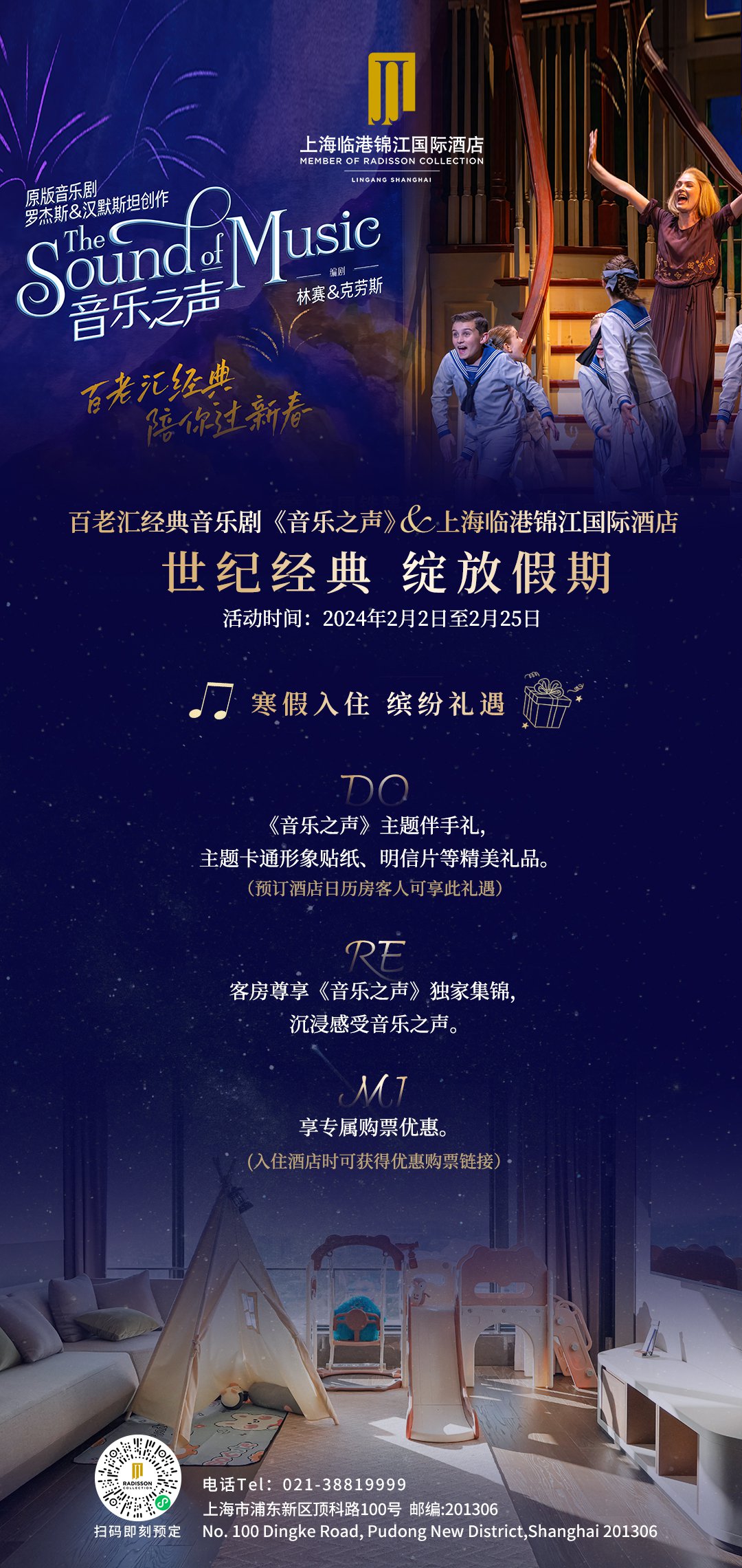 寒假与新春期间(2024年2月2日至2月25日),入住上海临港锦江国际酒店指定客房即可获得《音乐之声》独家限定伴手礼,还能观赏到酒店为《音乐之声》量身打造的亲子频道——可全天候欣赏音乐剧独家集锦:演唱片段、花絮后台、主演采访视频,带宾客重温那些熟悉的歌曲,感受音乐与生活的美好。