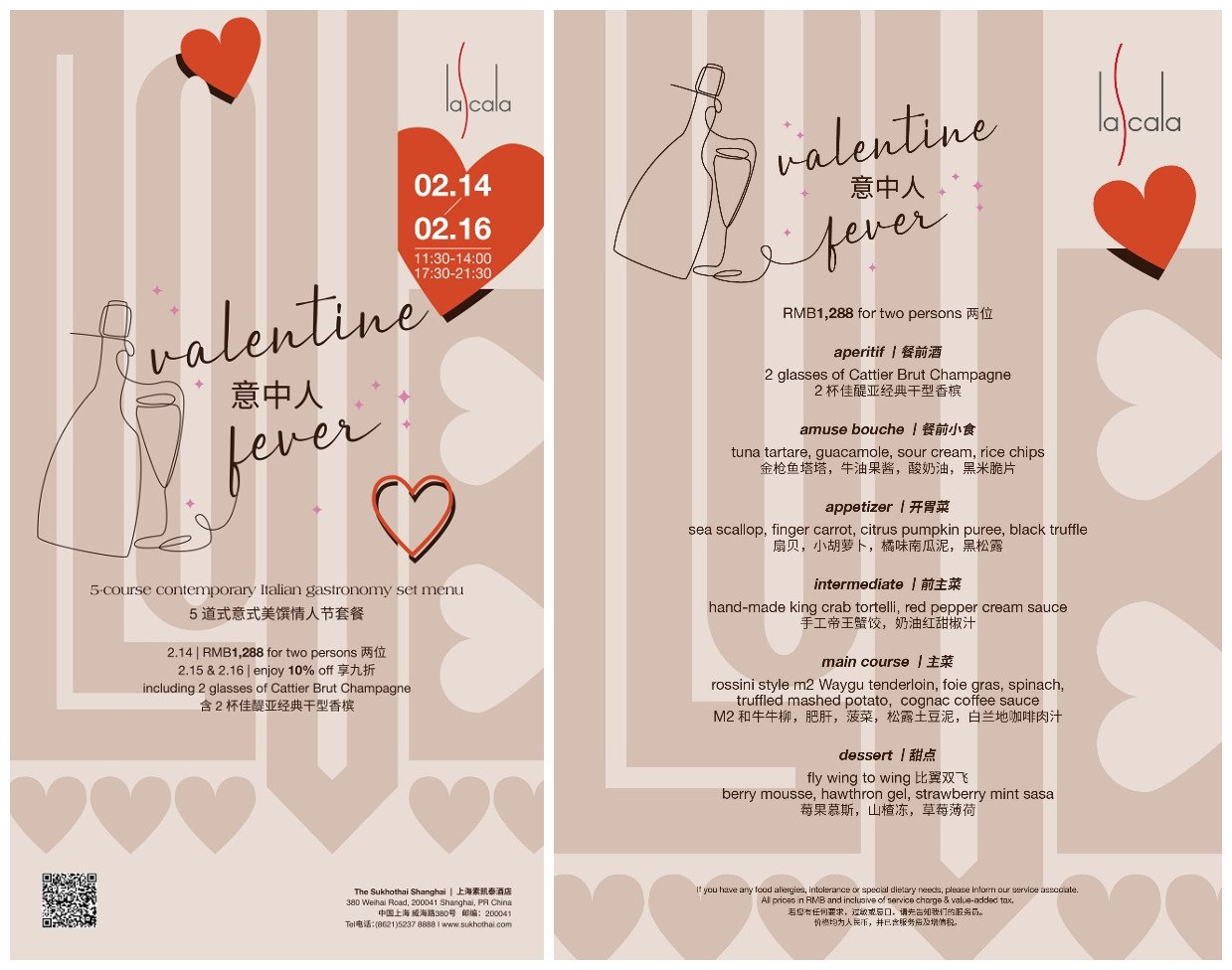 悦享浓情蜜意,最爱意中人。久负盛名的上海素凯泰酒店意大利餐厅La Scala2024年2月14日-2月16日带来5道式意式美馔情人节套餐,含2杯佳醍亚经典干型香槟。这个佳期,与你有约!