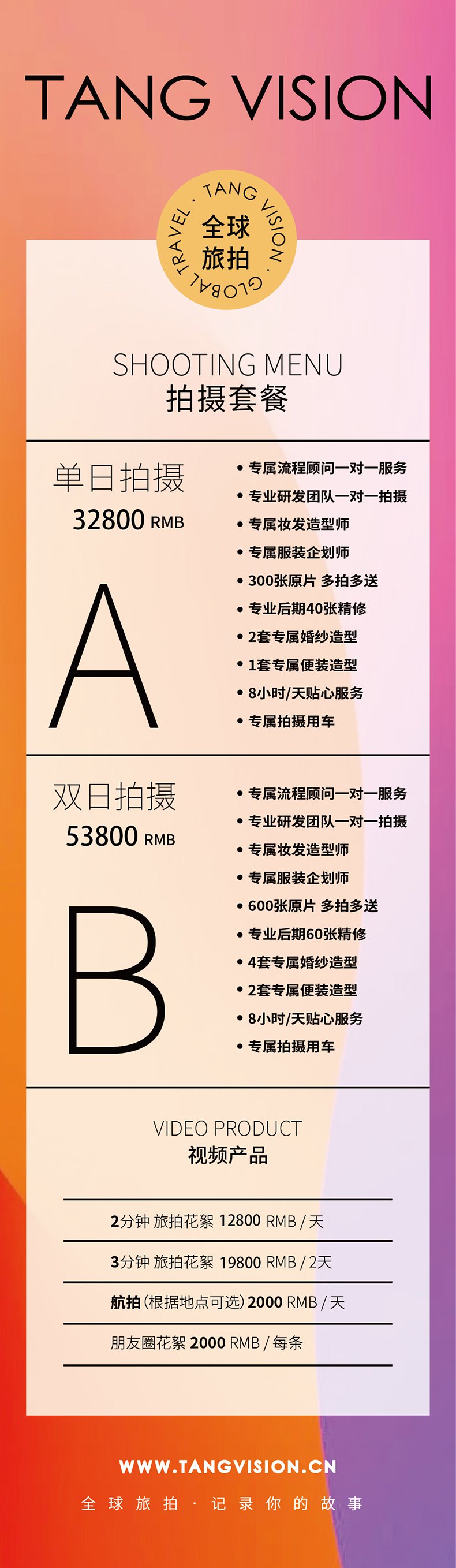TANG VISION自2009年在婚礼摄影领域崭露头角,至今已经发展为一个成熟优秀并有极高知名度的品牌;在上海、北京、杭州、广州、丽江、三亚、新疆都开设了工作室;TANG VISION现队员400余人,全国营业面积12000方;每年度服务3万余人。旗下产品线包括:婚礼跟拍、婚纱旅拍、个人写真、宝宝照、全家福的拍摄等;整个团队每年服务数万名客户,来自全国各个城市;旅拍部门每年前往全世界二十多个国家,足迹遍布几十个城市;并为多名明星、艺人、红人、博主提供专业拍摄。