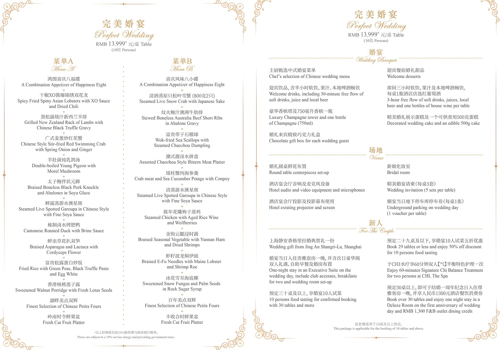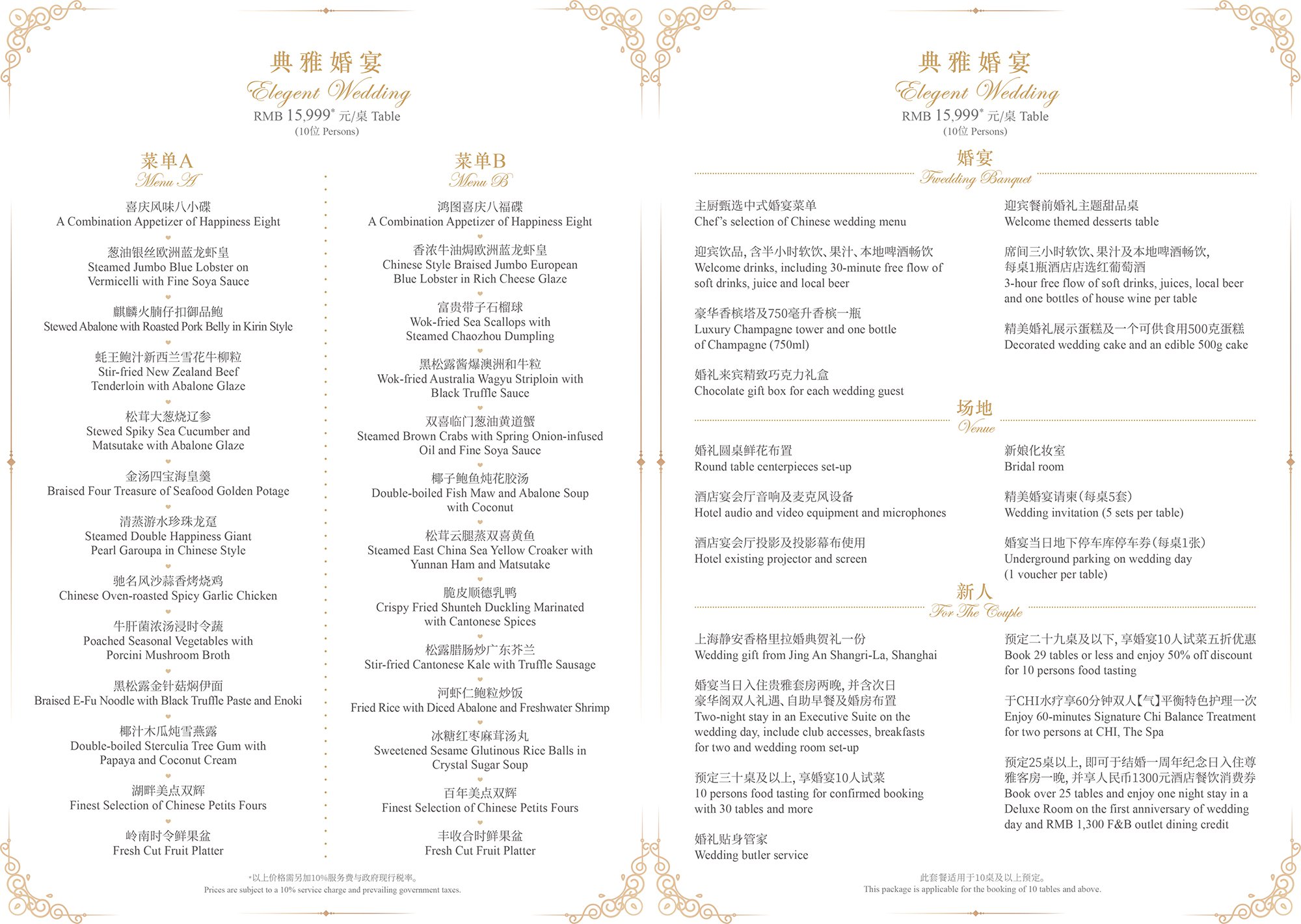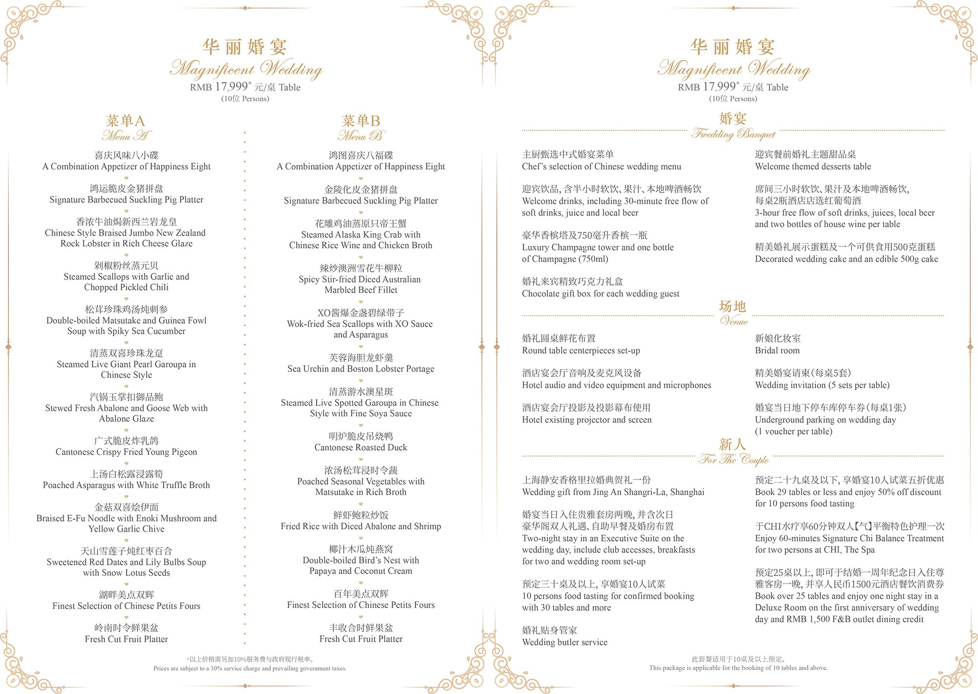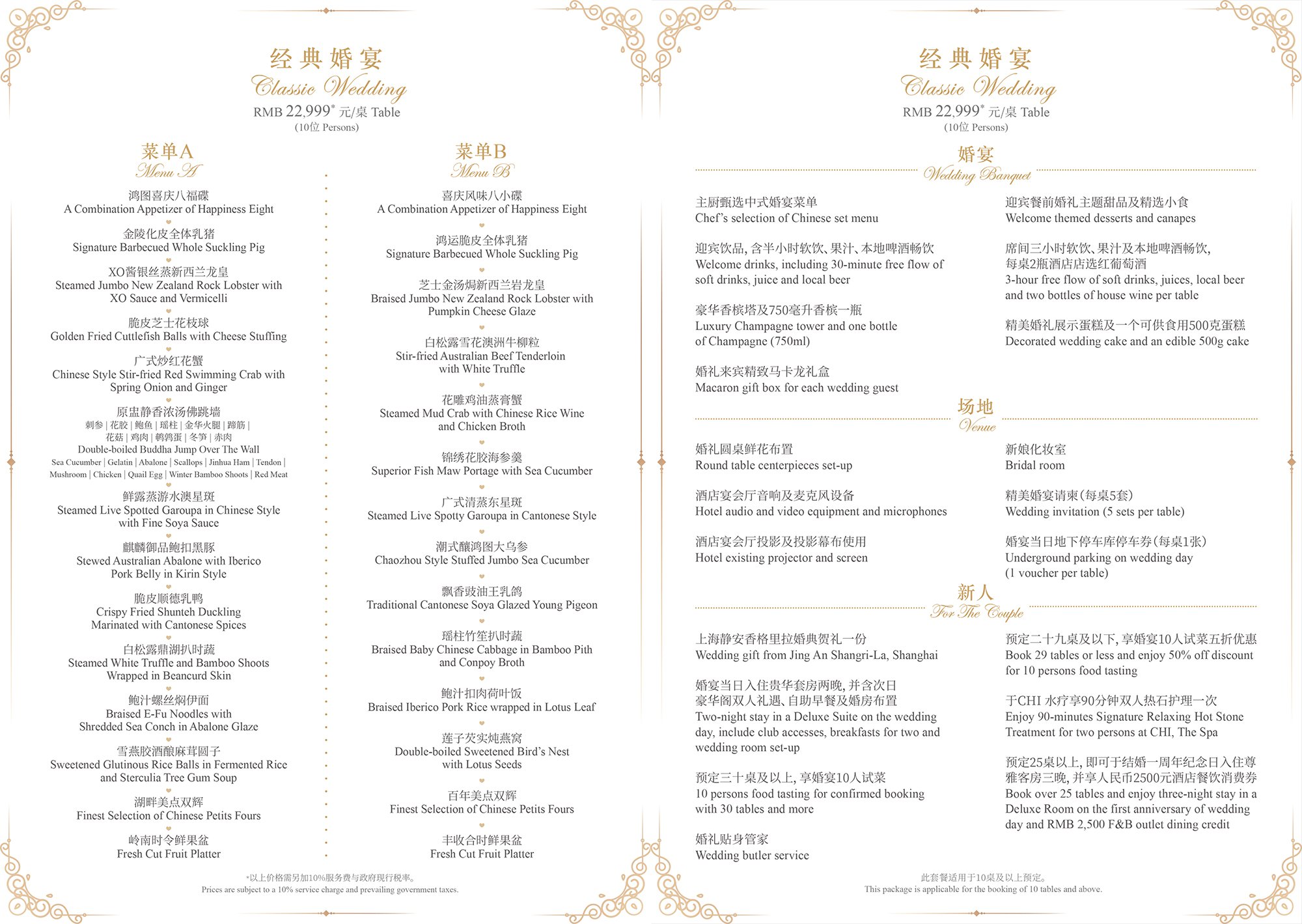 酒店的宴会及会议场地的整体面积高达4,465平方米,包括一间面积达1,743平方米,层高10米,规模宏大、气势磅礴的静安大宴会厅,辅以1,039平方米的前厅及露台花园、一间514平方米的宴会厅以及六间总面积达659平方米的多功能厅。为了无时无刻都给顾客难忘的体验,静安香格里拉婚宴特色菜也进行了全面升级,特邀巴黎香格里拉香宫主厨Samuel Lee 特别设计。属于您们的专属定制,每桌人民币11,999++起。(具体婚宴价格请致电酒店宴会销售详询)