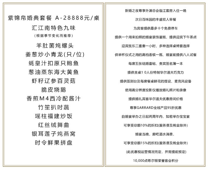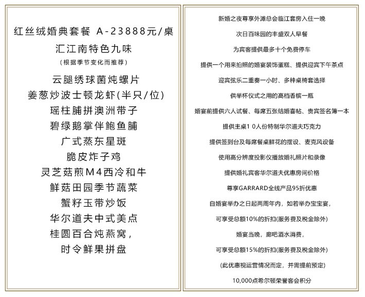 上海外滩华尔道夫酒店的上海总会厅完整地保留了大上海黄金时代的辉煌,富丽堂皇、气势恢宏,依托着美丽如画的浦江盛景,无疑是举办尊贵奢华婚礼的理想之处。这一历史悠久的场所,以及其中令人叹为观止的建筑和装修元素,融合欧式古典风格,构成一幅美丽图画,将标志着您与爱侣新婚生活的开始。这一在上海超受人们追捧的场所将会为您和您的宾客们呈现令人叹为观止的场景。奢华的氛围、高雅的花饰和令人垂涎欲滴的中西式美食成就了魅力四射的婚礼盛宴,令出席的宾客们在婚礼结束后久久不能忘怀,津津乐道。 精选的华尔道夫婚礼套餐将为您把梦想中婚礼的每个精致细节完美呈现。华尔道夫酒店的婚礼专员将与您一同参与计划婚礼的每个步骤,竭力为您打造一个精致、唯美的婚礼盛宴,令这一重要时刻更加熠熠生辉。在这特别的日子,我们的婚礼专员和宴会团队们将负责所有事务,确保精美的花饰和无懈可击的餐桌布置形成一幅完美而又精致的图画,作为主角只需沉浸在这浪漫的时刻。相信这将成为您和他的终生难忘的美好回忆。