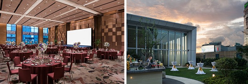 位于上海五角场凯悦酒店(Hyatt Regency Shanghai, Wujiaochang)六楼的中庭花园采用中式园林设计理念,竹林环绕, 15米玻璃天顶,自然光充足,踏足其中如闯入一片世外桃源、都市绿洲之中,是各式聚会的绝佳场所。位于酒店7楼大宴会厅外的户外草坪,绿意盎然,更可远眺城市景观,观日升月落, 更设有户外吧台,适合各类户外聚会派对。连接草坪的沁亭,三面玻璃环绕,白色装饰映衬其中,端庄典雅外营造出朦胧写意的氛围。