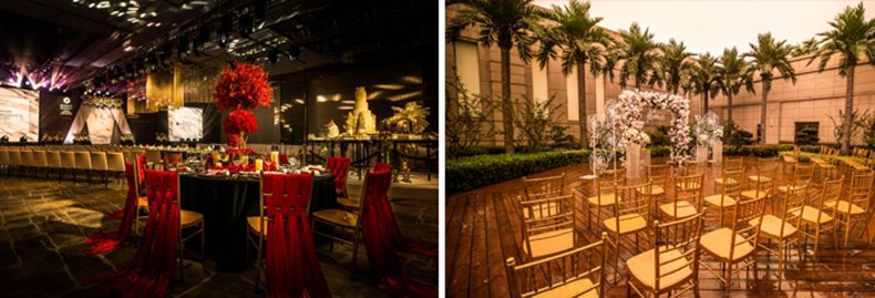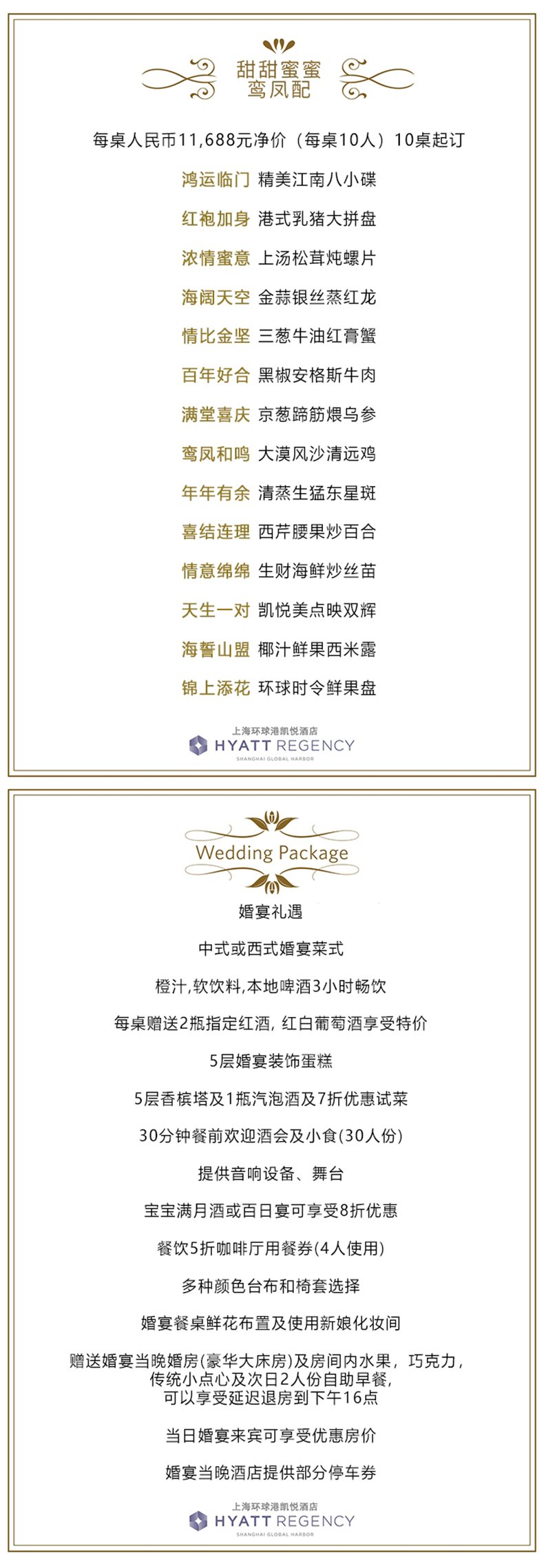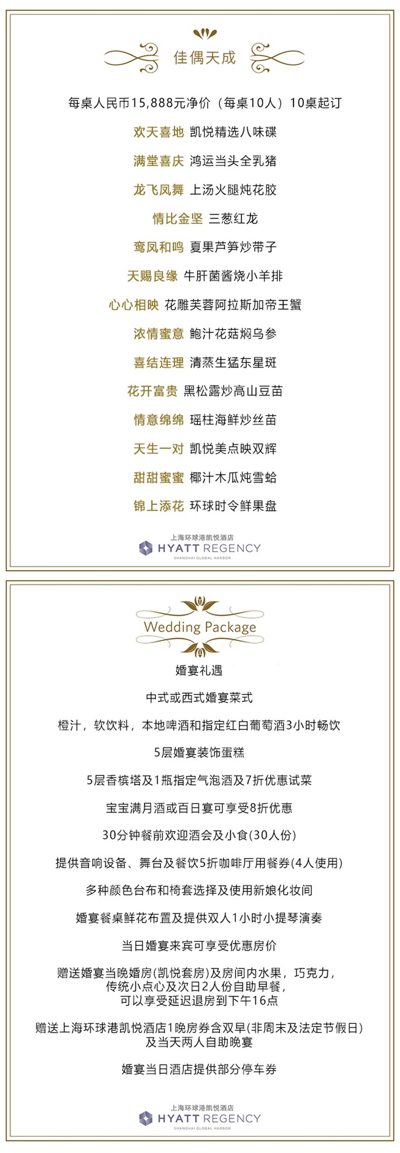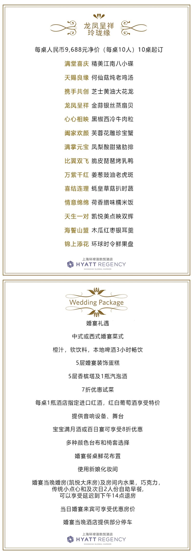 上海环球港凯悦酒店为客人营造终生难忘的浪漫婚礼,新人们在此许下终身相伴、不离不弃的庄严承诺;执子之手,永结同心。凯悦大宴会厅的设计充满祥和喜庆,层层围绕的水晶吊灯象征着新人“珠联璧合”、“圆满吉祥”,最多可容纳50桌婚宴,适合举办盛大宴会,也可以隔断成为三个稍小型的场地。新人还可以在前厅外的婚礼草坪,在明媚阳光或璀璨星光下,举办仪式,许下相伴一生的婚礼誓言。新婚夫妇将携手从缀满鲜花的草坪上款款走来,接受亲友的祝福。大宴会厅一侧的40平方米新娘休息室包括试衣间、化妆区域、休息区域和带淋浴的洗手间,确保新娘休息充沛、容光焕发地展现在亲朋面前。酒店专业的婚礼策划人员将负责场地装饰、婚宴主题、定制菜单、个性服务等所有重要细节,确保新人和来宾倾情投入,享受一场终生难忘的梦幻婚礼。