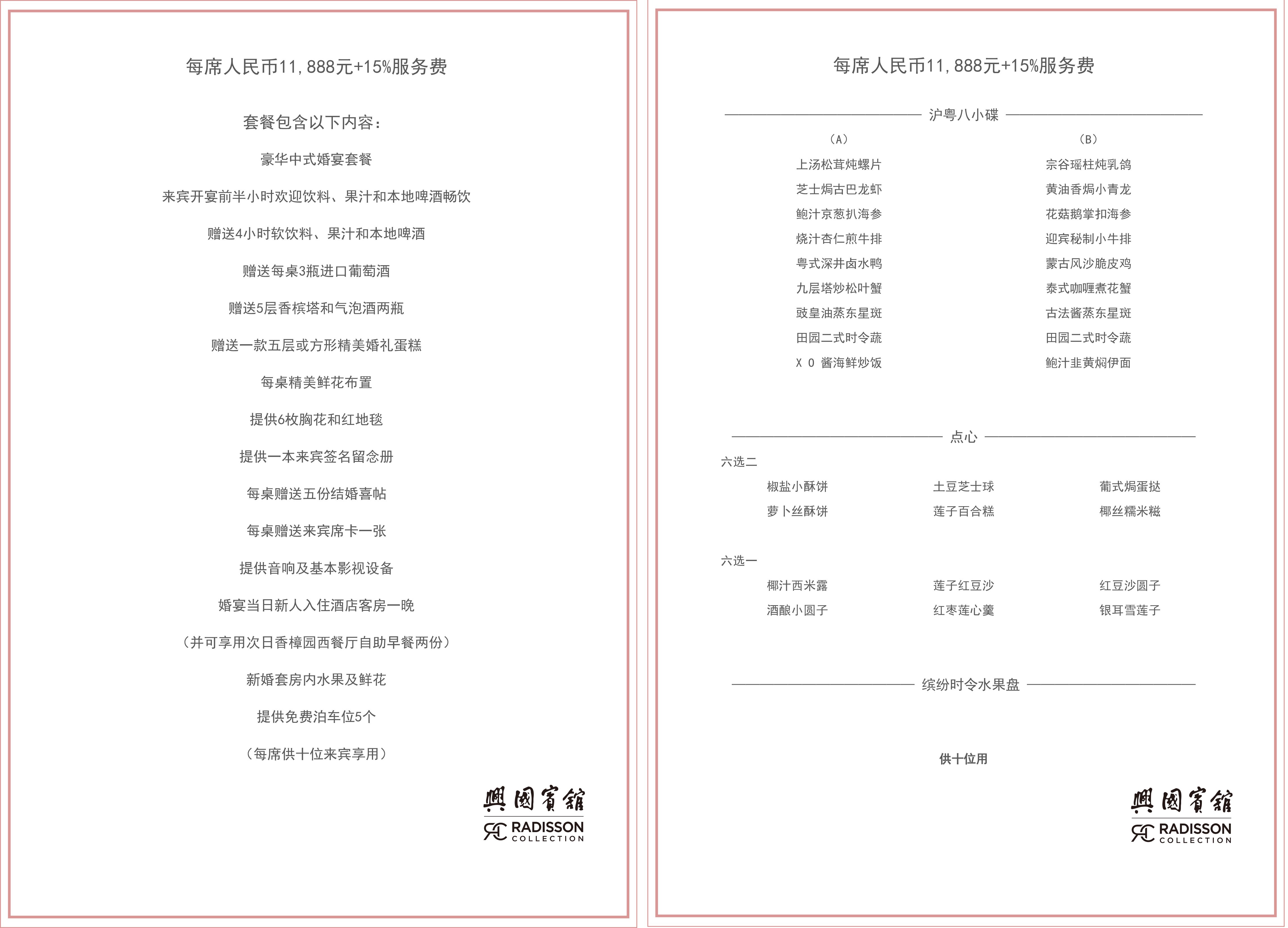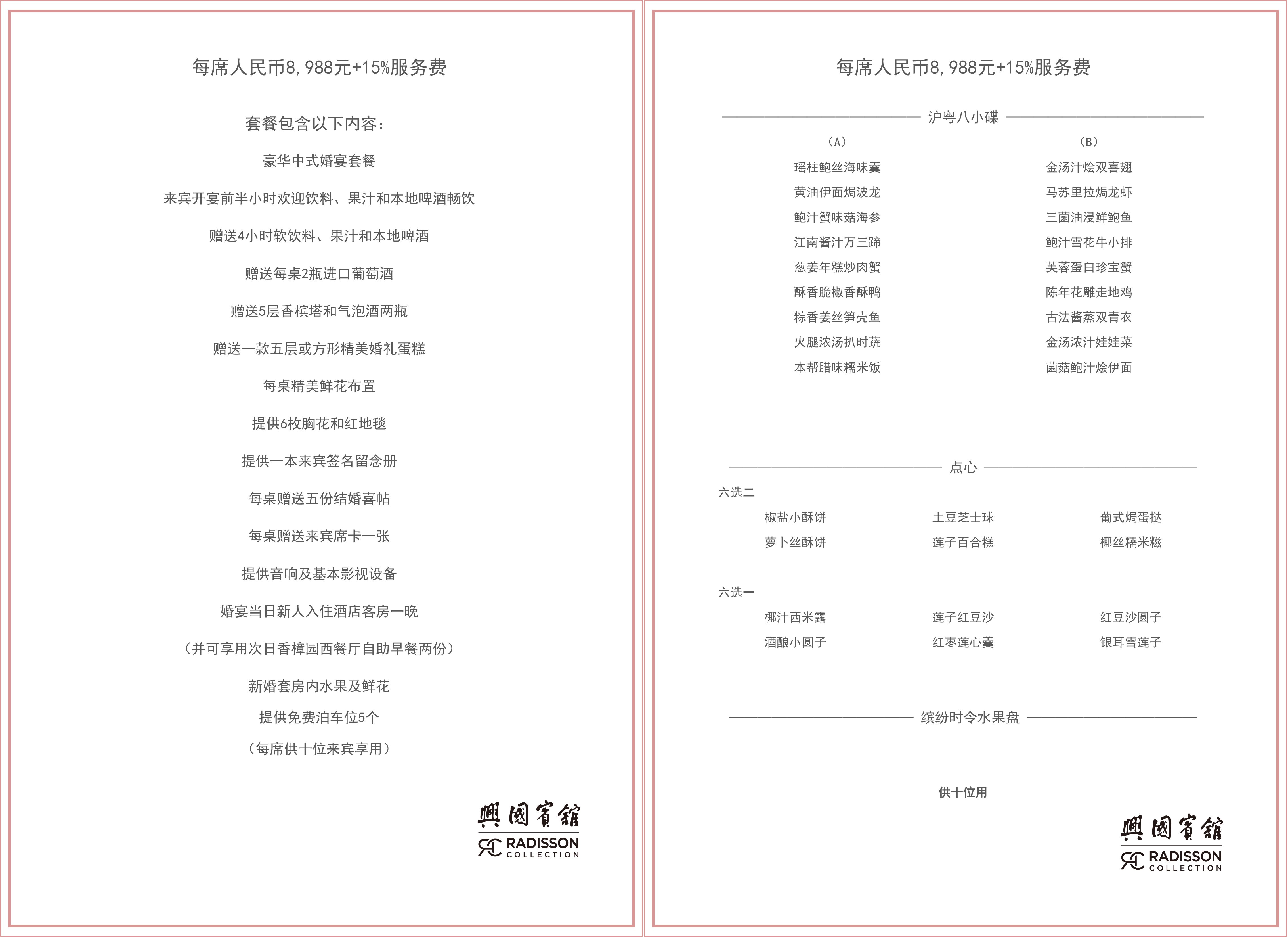 上海兴国宾馆丽笙精选坐拥市中心70000平方米的大花园,环境静谧幽雅、绿意葱茏,适宜举办浪漫豪华的花园婚礼,中西合璧、独特优雅,配有丰富的菜单供你选择。专为国宴掌厨的特级厨师们精心为您烹制每一道精美婚宴佳肴,专业精干的宴会服务团队为您的婚礼筹备所有繁缛细节,定会让您的婚礼完美无瑕、永生难忘!