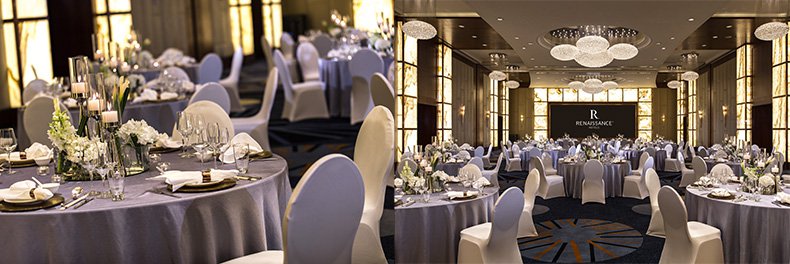 上海明捷万丽酒店拥有521平米无柱豪华大宴会厅,厅内设有先进的影音及灯光设备,可同时容纳28桌宴席。宴会厅位于酒店2楼,5.5米层高,宽敞无柱,拥有璀璨夺目的水晶灯、完备先进的宴会灯光及音响系统,适合各种形式与主题的婚礼