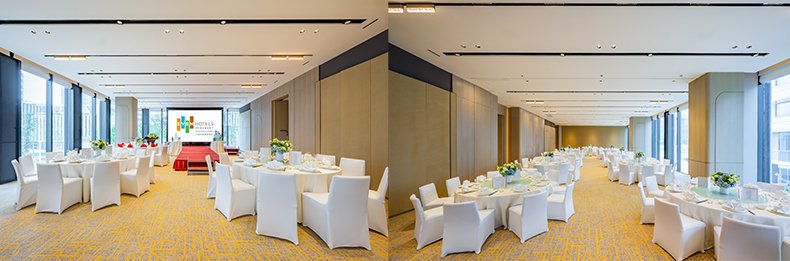 酒店拥有236平方米的大宴会厅,亦可拆分成两个小宴会厅使用,可同时容纳8-15桌齐聚一堂,共同见证新人喜结连理。酒店拥有一支经验丰富、专业素质过硬的婚宴策划团队,全程负责协助新人筹备婚宴,并协调各个环节的顺利进行。先进的音响设备、丰富多彩的光影特效,为婚宴增添浪漫温馨的氛围。专业厨师团队精心设计丰富多样的菜品,包含中式、西式和特色菜肴,满足不同口味的需求。两款精心定制的婚宴菜单每桌售价4688元。