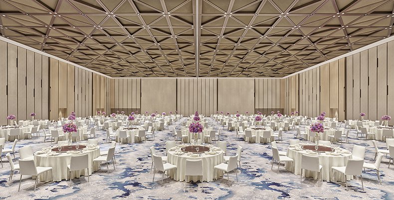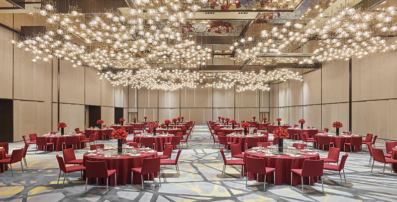酒店同时拥有约1500平方米宴会厅,无柱方正的设计气派不凡。层高7米的雅辰宴会厅,挂上设计独特的吊灯如繁星点点,增添了奢华优雅的气韵。宴会厅休息区域亦可饱览滴水湖全景。370平草坪,更是户外仪式的绝佳选择。