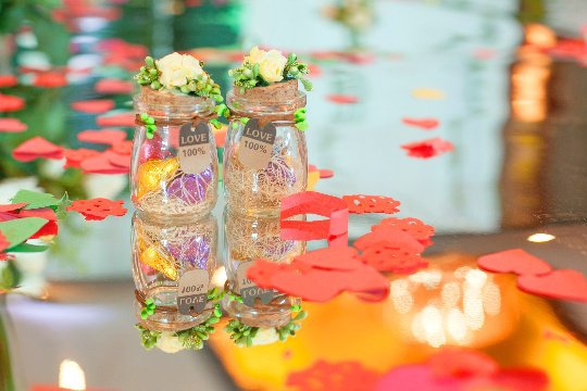 2.玻璃瓶喜糖盒:透明玻璃瓶,干净整洁,可以二次利用,盛放喜糖的同时,还能作为饰品收纳盒。