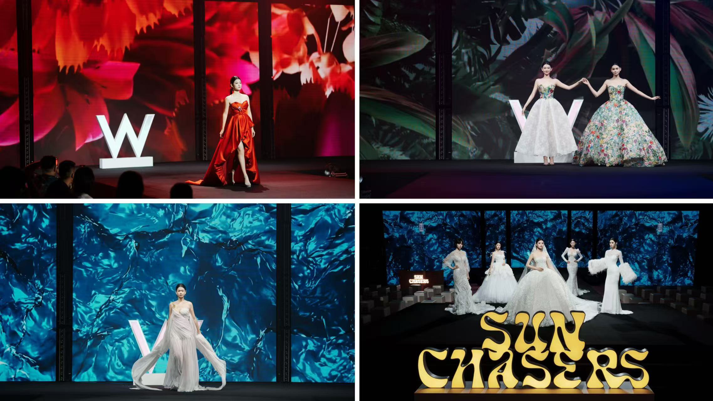 整场「追光逐夏·热辣婚礼」主题宴会秀在苏州W酒店音乐总监Marc Lussier的炫音灯光秀中拉开帷幕。模特们伴随潮流音乐优雅登场,演绎两大主题婚纱系列:H.U. Wedding "追光逐夏"系列以轻盈礼服融合阳光与海浪元素,演绎出灵动鲜活的夏日风尚;随后的"深海绮梦"系列则通过鱼尾廓形婚纱缀以水晶蕾丝与珍珠流光,在T台上铺陈出人鱼公主般的梦幻深海幻境。