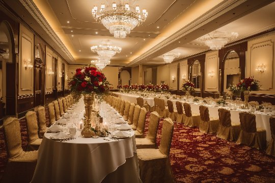 闪耀的水晶吊灯投射出温暖柔和的光芒,璀璨的宴会厅里布置精美,五星级酒店为新人们打造了一个浪漫华丽的婚礼盛宴。这是一场梦幻般的婚宴,让每一位宾客都沉浸在幸福的氛围中。